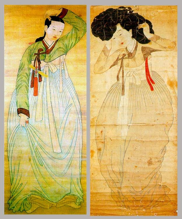 ? 왼쪽은 신윤복 申潤福 (1758-미상)작 미인도 (19세기초),비단에 담채,113.9 x 45.6cm, 간송미술관