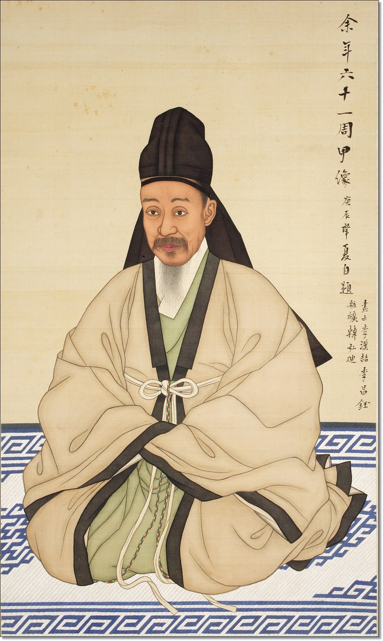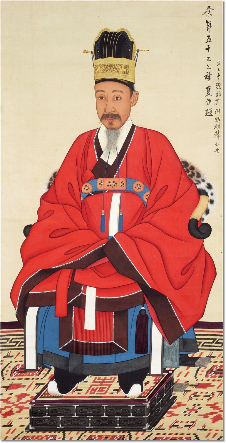 흥선대원군은 초상화를 그린 내력을 오른쪽에 기록하였다. ' 경진년에 태어나 기사년에 초상을 그리니 이때가 쉰살이다 ' 쉰 살이라니 ! 웬걸, 치켜뜬 눈과 도톰한 눈두덩, 탱탱한 피부에 기운이 성하다. 실은, 44세 때 초본을 그려놓았다가 6년 뒤에 완성한 그림이다. 나이에 비해 젊은 안색이 슬며시 끼어 들어간 것은 그 때문이다. 흥선대원군의 50세는 ' 10년 섭정(攝政)'의 이력이 붙었을 때이다. 이 그림에 느긋한 자신감이 보인다.