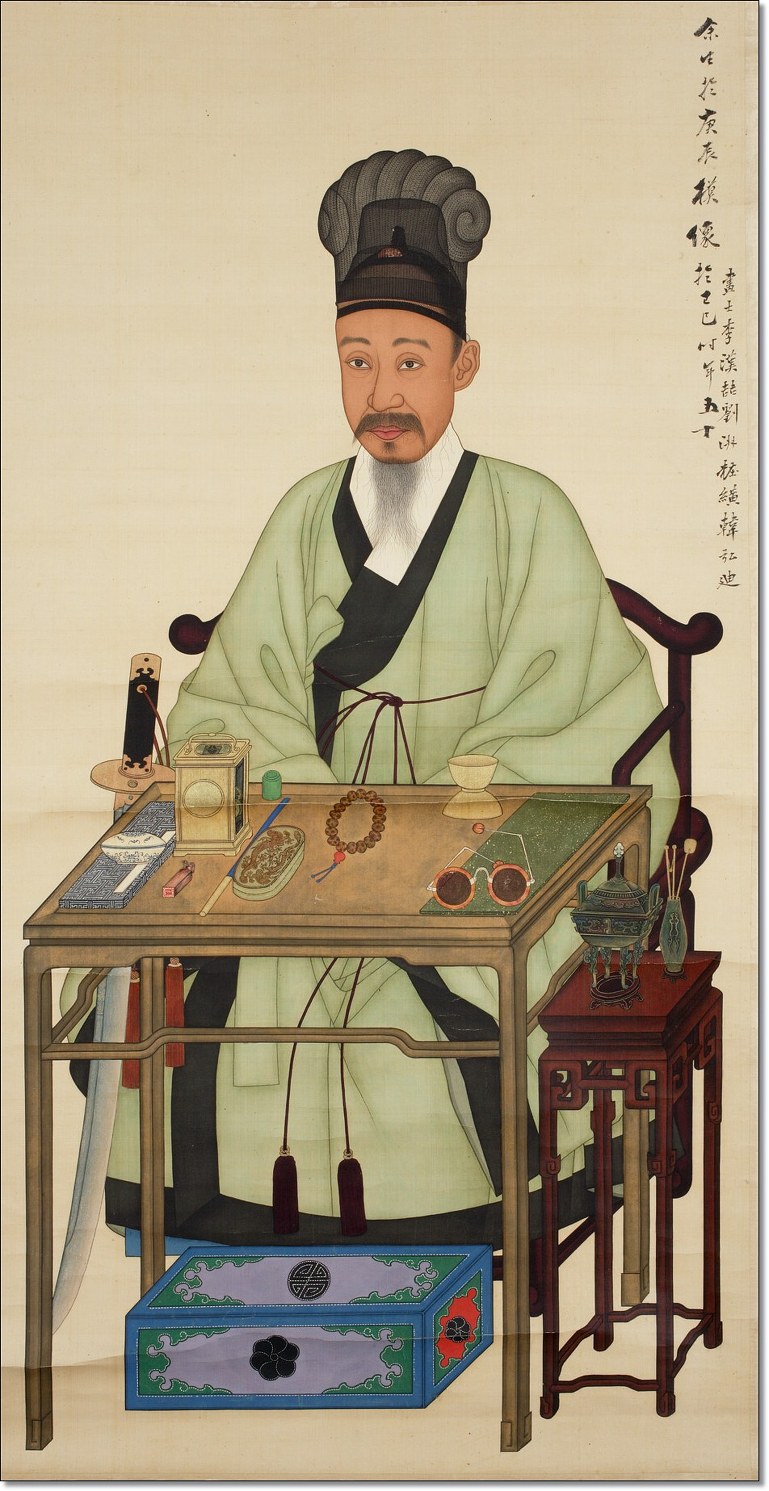 초상화의 형식도 매우 새롭다. 조선시대 초상화에서 유례가 드물게 장식품이 가득하다. 키 높은 탁자에 놓인 기물(器物)은 서첩, 청화백자, 도장, 탁상시계, 벼루, 단주(短珠), 타구, 안경 등이다. 협탁에 향로와 향꽂이, 발치에 팔을 괴는 장침이 있다. 모두 초상화의 주인공이 아끼던 물건이다. 탁자에 세워둔 칼, 칼집에서 칼을 뺏다.