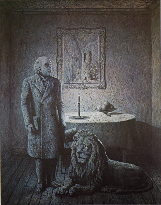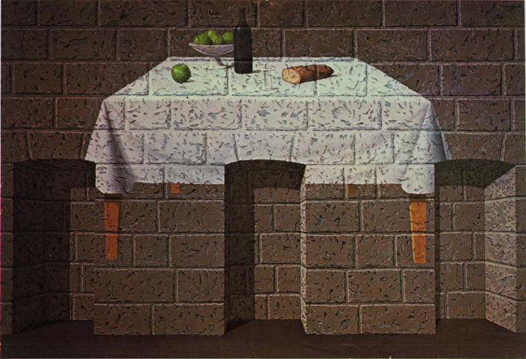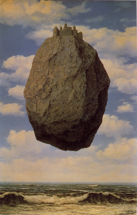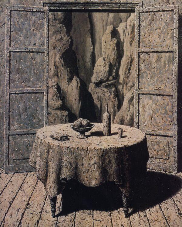 벽에 걸려있는 그림 속에 보이는 갈라지고 불가사의한 탑은 마치 <우상>이나 <피레네 산맥의 성>과 같은 작품에서처럼