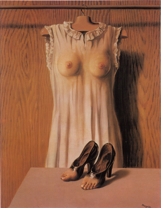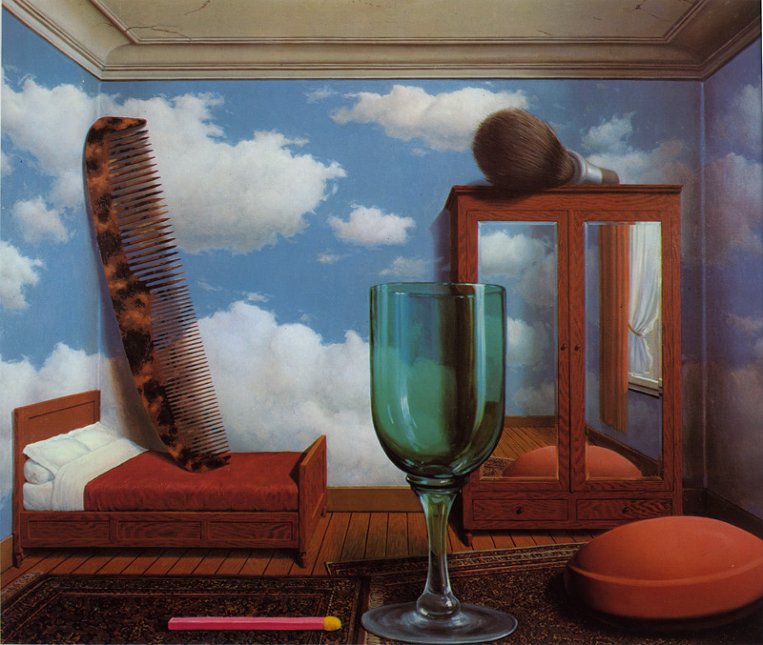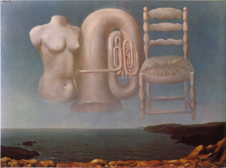 마그리트의 회화는 친숙한 대상들과 재현된 대상들 사이에 비정상적인 관계를 이룩하면서, 객관적인 방법에 의한 세부 묘사에 따라 재현된다. 이런 선회는 단순한 탈문맥성에서 출발 가능한 다양한 메커니즘으로부터(공 모양, 또는 나무 손잡이로 형성된 숲, 하늘을 날아다니는 종) 갈등적인 연상방법으로(가슴은 눈으로, 성기는 입으로 형성된 얼굴이자 동시에 누드 토르소), 또는 모순적인 방법에 의해(열려진 문 위에 걸려 있는 구름, 재현된 실제 풍경과 그려진 풍경과의 혼돈) 창출된다.