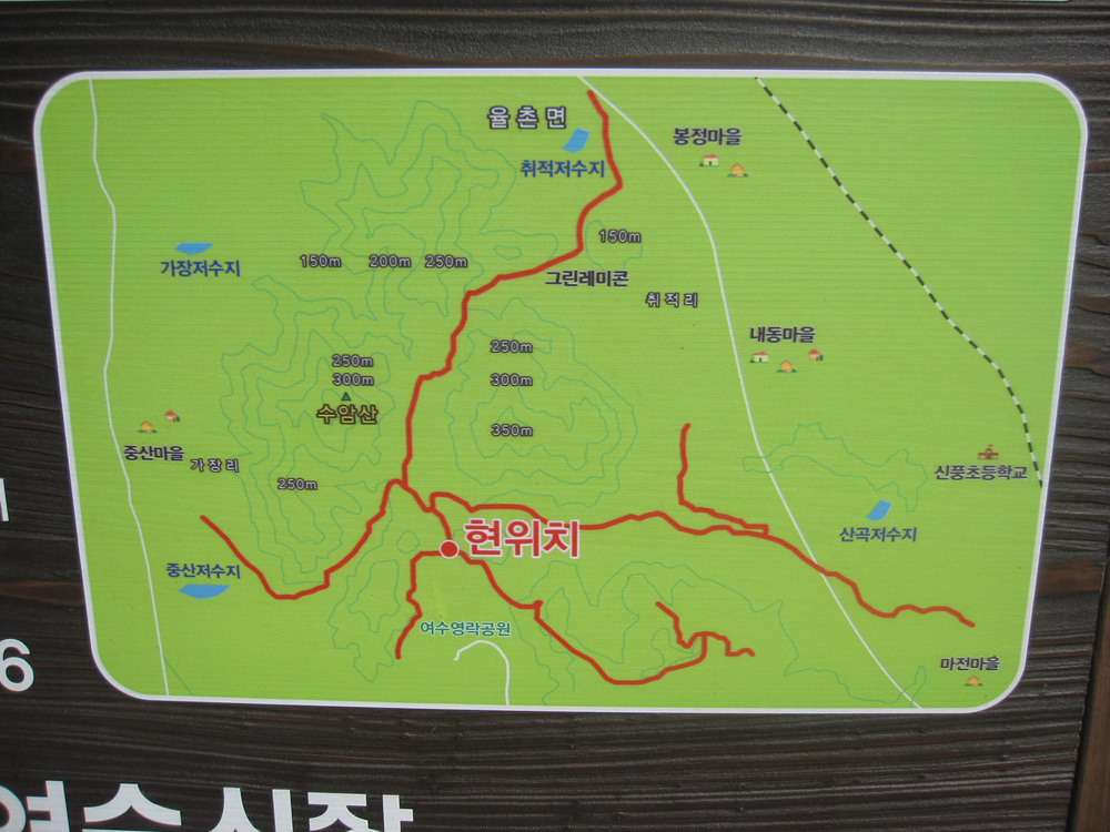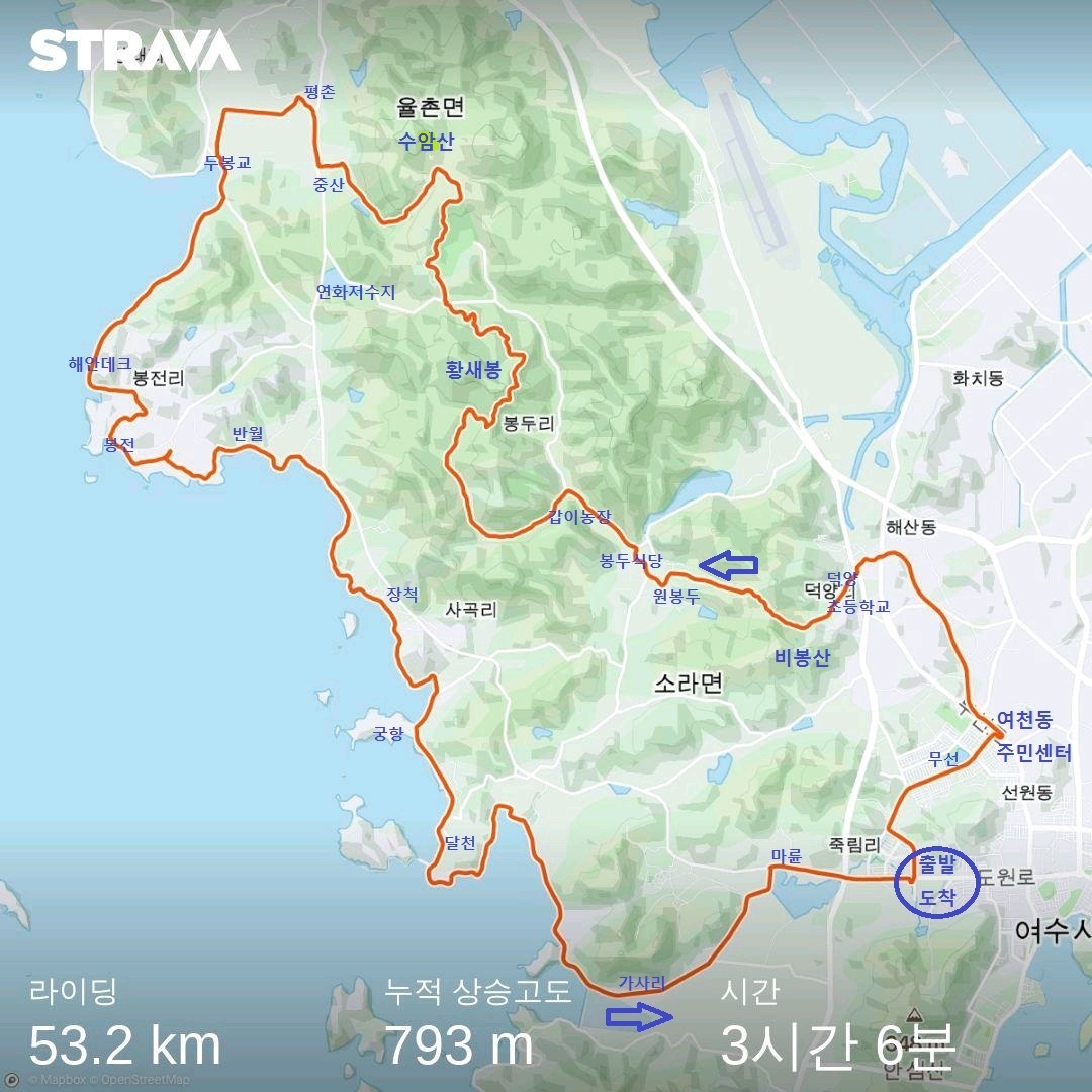 코스 : 죽림~무선~자전거도로~덕양~비봉산 임도~원봉두~갑이농장~운암길~황새봉 임도~여수 영락공원