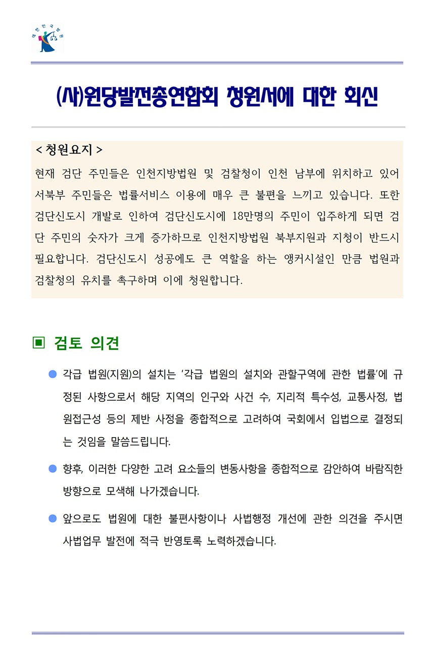 (사)원당발전총연합회에서 검단신도시에 인천지방법원 북부지원 및 인천지방검찰청 북부지청을 설치해 달라는 청원에