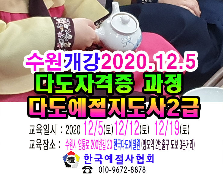 한국예절사협회는 2020 12 20 매주 일요일 다도 자격증 과정 개강합니다.