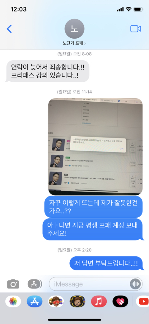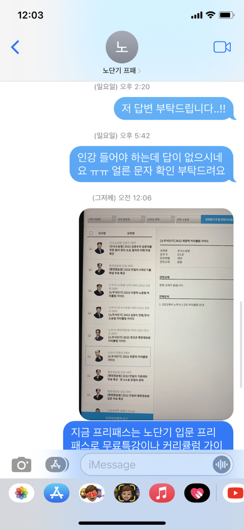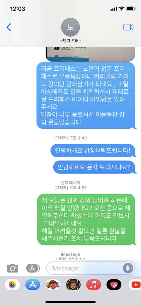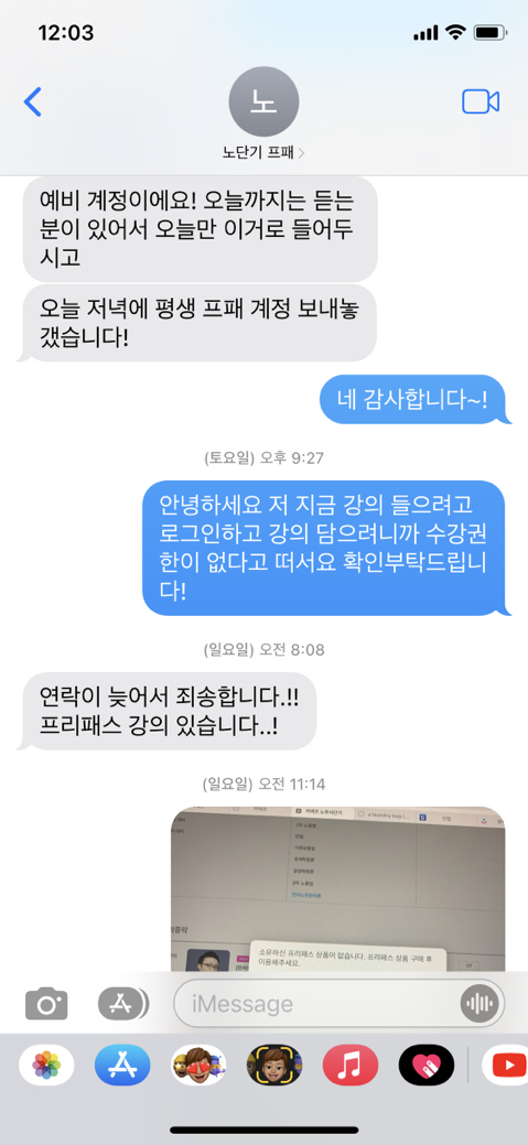 들어가서 보니 강의가 안담기길래 그냥 저녁에 다른 계정 준다니까 기다렸는데 안와서 문자 보냄