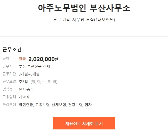 【아주노무법인 부산사무소】노무 관리 사무원 모집(4대보험팀) 작성자아톰J|작성시간23.04.25|조회수452 목록 댓글 0 글자크기 작게가 글자크기 크게가 【아주노무법인 부산사무소】노무 관리 사무원 모집(4대보험팀) http://joburl.kr/TR8AD[아주노무법인 부산사무소] | 노무 관리 사무원 모집(4대보험팀) - 알바몬클릭하여 상세내용을 확인하세요m.albamon.com 다음검색 현재 게시글 추가 기능 열기 북마크 공유하기 신고 센터로 신고 댓글 댓글 0 댓글쓰기 답글쓰기 댓글 리스트