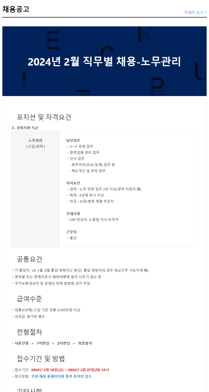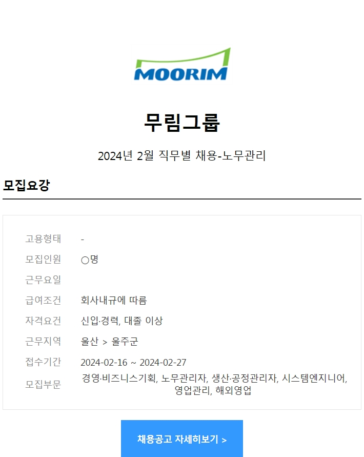 [구인][무림그룹] 2024년 노무관리 담당자 채용 작성자취업멘토|작성시간24.02.17|조회수315 목록 댓글 0 글자크기 작게가 글자크기 크게가 [무림그룹] 2024년 노무관리 담당자 채용http://joburl.kr/vHDM9 무림그룹 채용 - 2024년 2월 직무별 채용-노무관리 | 잡코리아경력 : 신입·경력, 학력 : 대졸이상 (졸업예정자 가능), 급여 : 회사내규에 따름, 마감일 : 2024.02.27www.jobkorea.co.kr (자료제공 : 잡코리아) 다음검색 현재 게시글 추가 기능 열기 북마크 공유하기 신고 센터로 신고 댓글 댓글 0 댓글쓰기 답글쓰기 댓글 리스트