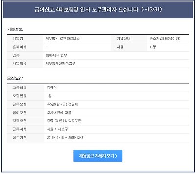 [세무법인 로앤파트너스] 급여신고,4대보험 및 인사 노무관리자 모십니다. (~12/31) 작성자닭한마리00|작성시간15.11.30|조회수329 목록 댓글 0 글자크기 작게가 글자크기 크게가 채용정보 | 신입공채 | 공채달력 본 정보는 기업에서 제공한 자료를 바탕으로 잡코리아가 편집 및 그 표현방법을 수정하여 완성한 것입니다. 본 정보는 잡코리아의 동의 없이 무단전재 또는 재배포, 재가공할 수 없으며, 게재된 채용기업과 채용담당자의 정보는 구직활동 이외의 용도로 사용될 수 없습니다. 잡코리아는 게재한 자료에 대한 오류와 사용자가 이를 신뢰하여 취한 조치에 대해 책임을 지지 않습니다. <저작권자 (c)잡코리아. 무단전재-재배포 금지> 다음검색 현재 게시글 추가 기능 열기 북마크 공유하기 신고 센터로 신고 댓글 댓글 0 댓글쓰기 답글쓰기 댓글 리스트