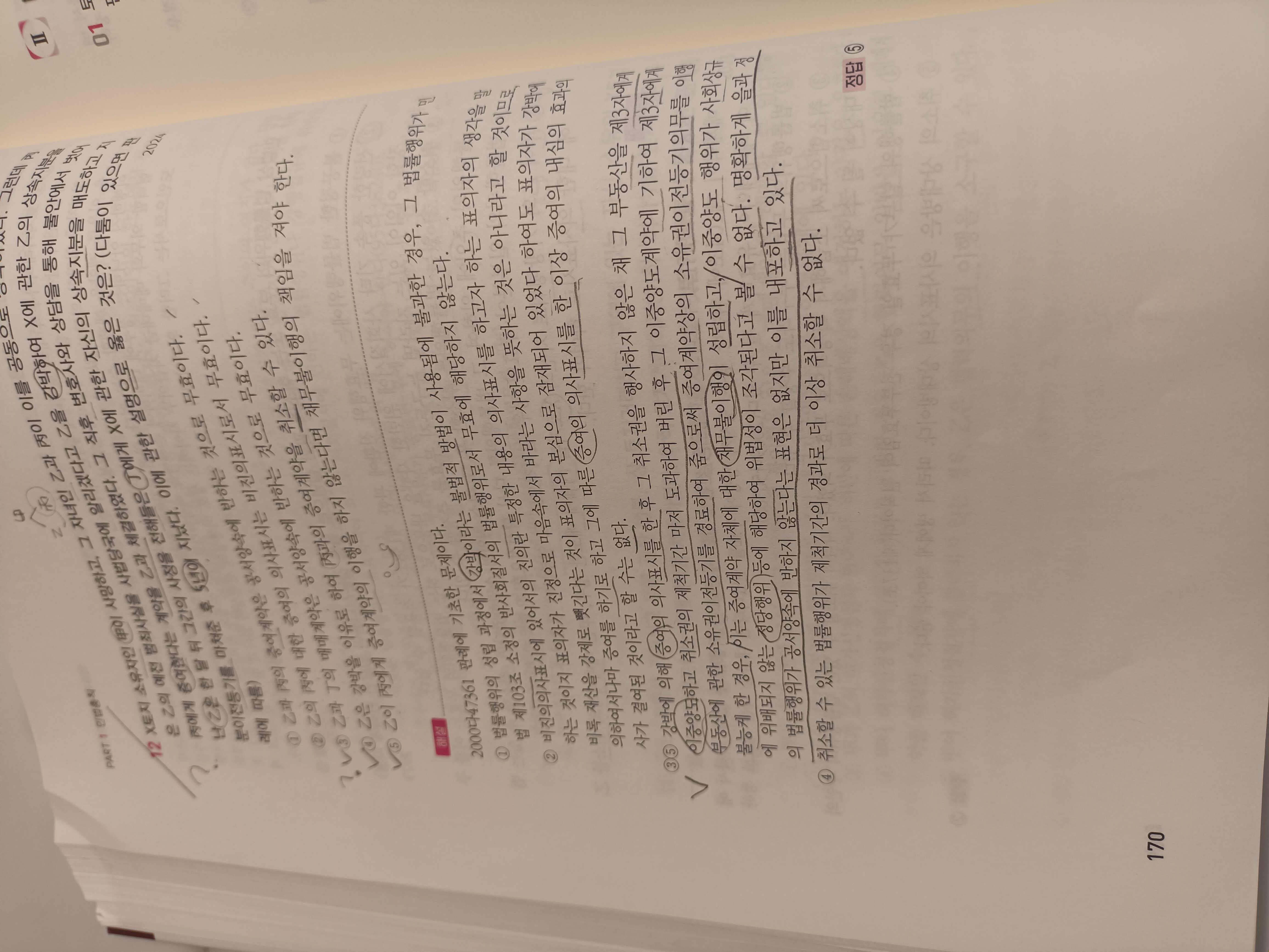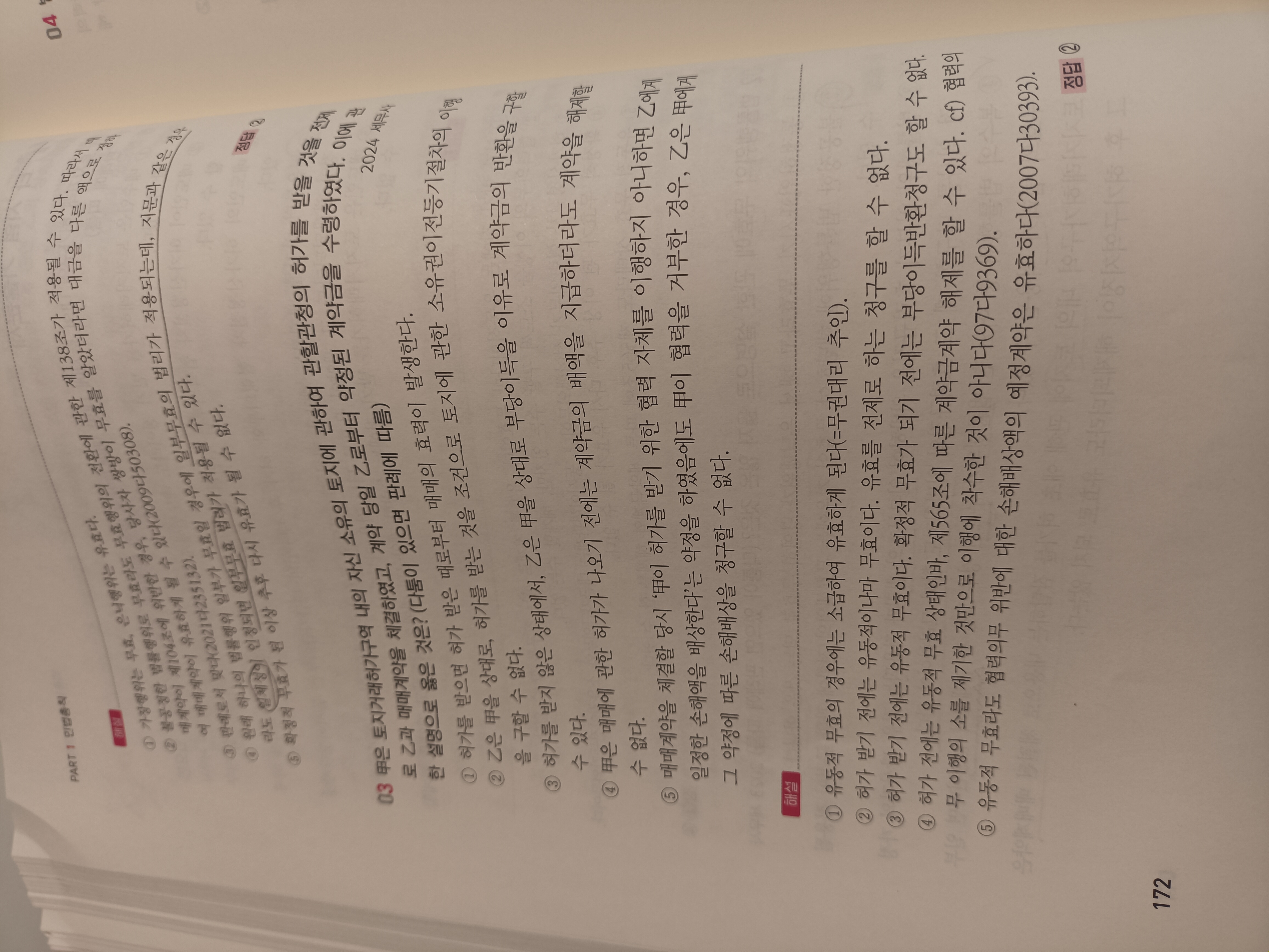 3. 172쪽 4번보기 해설에서 하나의 법룰행위 일부가 무효일경우 전부무효법리가 적용되는데 일체성이 인정되면 일부무효법리가 적용될수 있다