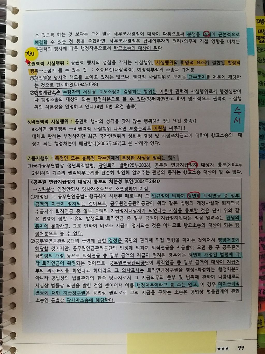 ③‘이 사안은 이 판례 하나다‘라는 only case 이자 특 A급은 단권화 책에 사안포섭까지 한꺼번에 붙여놓았고 판례원문을 찾아 프린트하여 보았습니다. 올해 1교시 2문 전출과 파견구분 문제도 이런 식으로 붙여 놓아 그대로 박기만 하면 되어서 가장 빠르고 풍부하게 쓴 문항이었습니다. 이렇게 6-7개쟁점 정도를 붙여놓았었는데 운이 좋게도 그중에 출제가 되어 시간절약이 가능했습니다.
