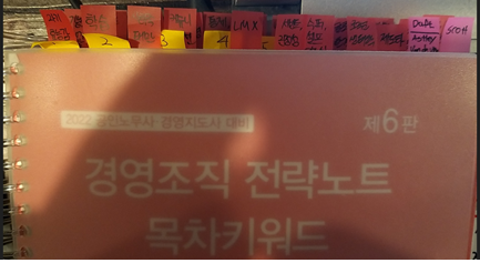 그리고 항상 반복하는 실수였던게 시험 전날에 1회독을 해본적이 없습니다,, 2교시 과목들은 반절하고 나머지는 시험장에 가서 쉬는 시간에 짜투리로 보는게 전부였습니다. 그래서 이번에도 혹시 모를 상황에 대비해 시험 한달 전부터 회독계획을 세울 때 일부러 책 마지막 부분을 먼저 보았습니다.(인사는 보상,유지,이직 파트/ 경조는 조직파트)