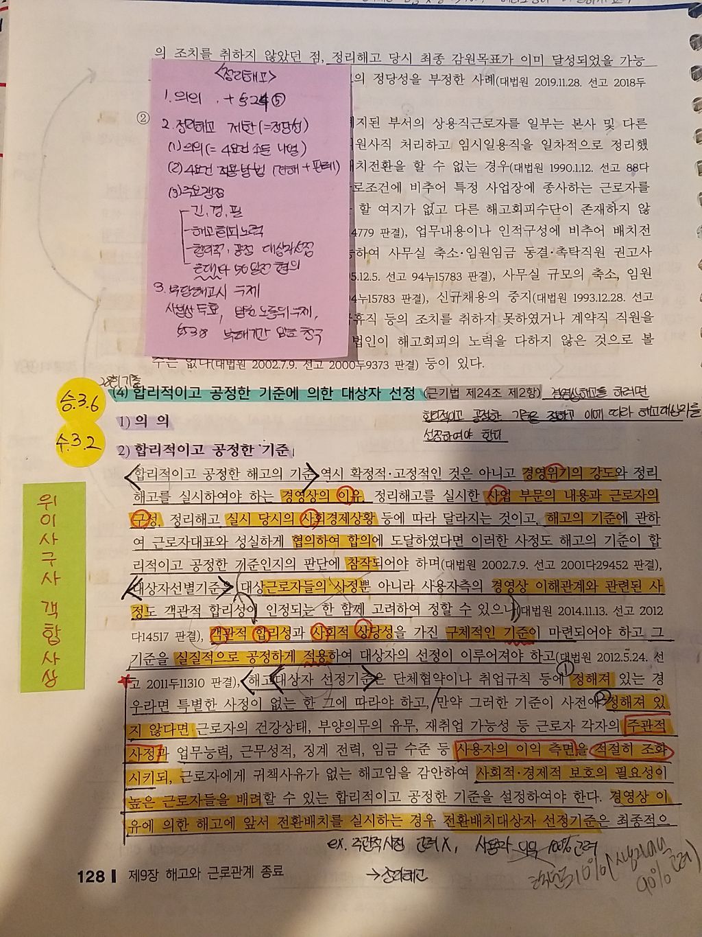 ⑤그리고 판례는 단순 암기가 아니라 ‘그 판례에 해당할 수 있는 사실관계는 무엇일까’를 생각하며 암기하였습니다. 가령 해고 서면통지의 판례에서 ‘이미 해고사유가 구체적으로 알고 있고 충분히 대응 할 수 있는 상황’에 해당하는 사실관계는 무엇일까?를 같이 생각하며 판례를 암기하는 것입니다.