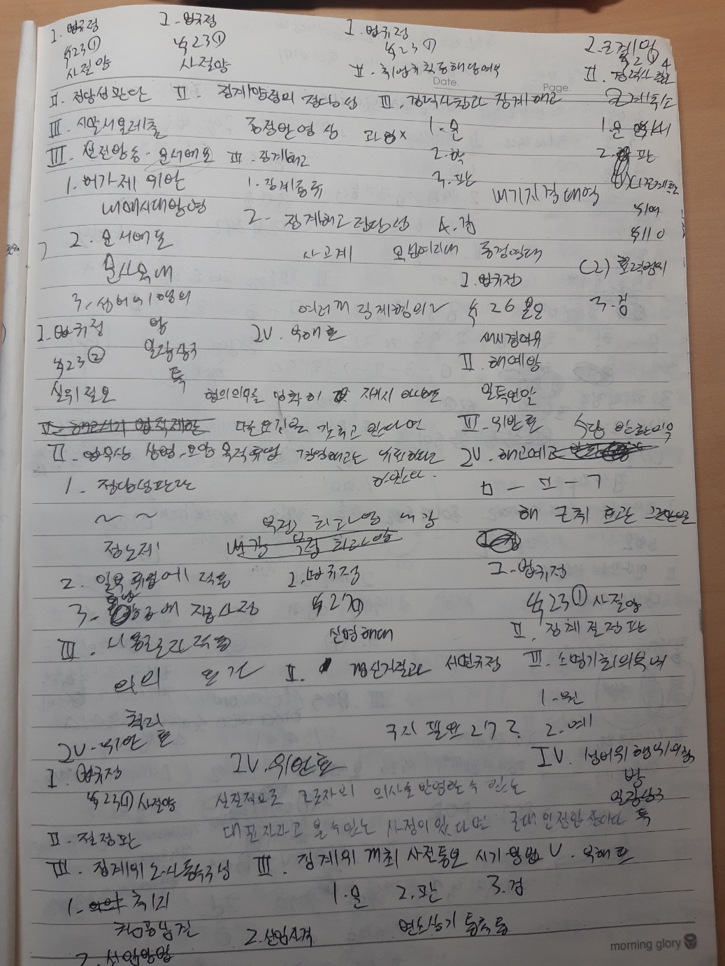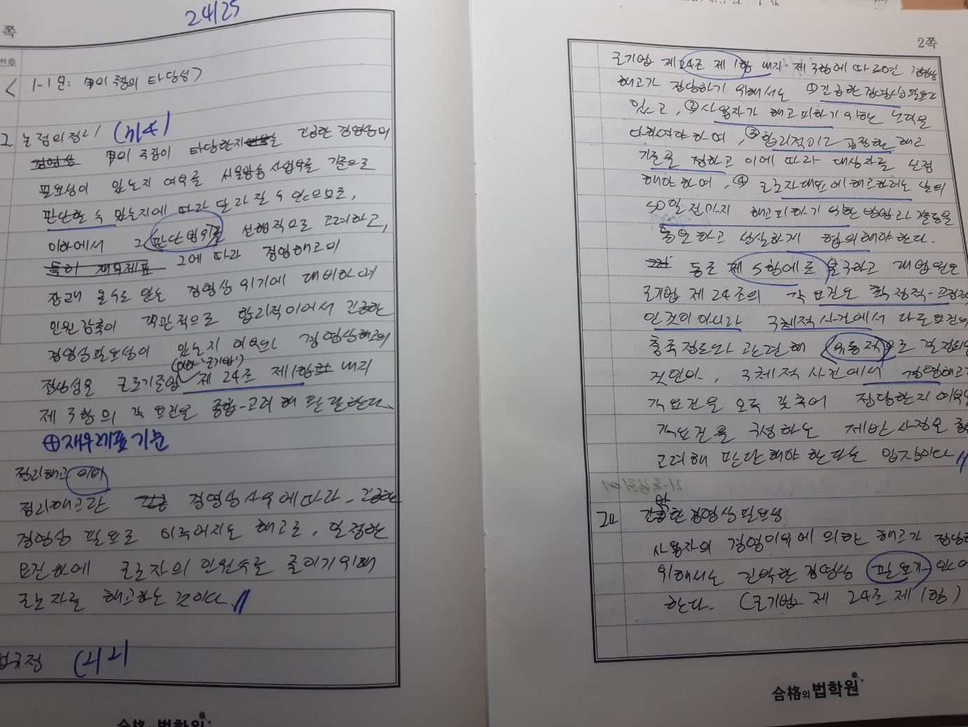 노동법은 유예시절에는 오로지 서브노트만을 회독의 교재로 삼았습니다. 에스더쌤의 사례집도 있었지만 이는 수업시간에 보는 것으로만 활용하였고 그외에는 시간을 더 투자하여 사례집을 열심히 보진 않았습니다. 기본서는 0기를 제외하면 거의 일체 보지 않았습니다. 그정도로 에스더쌤의 서브노트는 시험을 대비하는 측면에서 누락되는 부분이 거의 없었고 목차의 구성 또한 좋았습니다. 편한 공책에 서브노트에 나와있던 목차들을 적어 내려가고 그 이하의 내용을 떠올리기에 서브노트는 최적의 교재였던 것으로 기억합니다. 물론 처음에 리마인드를 시도했을 때는 대목차와 중목차까지는 그대로 보고 적고, 목차별 키워드 또한 잘 생각이 나지 않아 막히는 순간이 있습니다. 다만 그 과정을 여러번 거치면서 자책도 해보고 머리도 쥐어잡는(?) 고통의 순간을 견딘다면, 더디더라도 조금씩 발전하고 회독의 속도가 늘어나고 있는 모습을 볼 수 있었습니다. 이와 같은 방식으로 B+ 쟁점까지는 목차를 잡아가며 머릿속으로 리마인드하는 방식으로 반복했습니다.