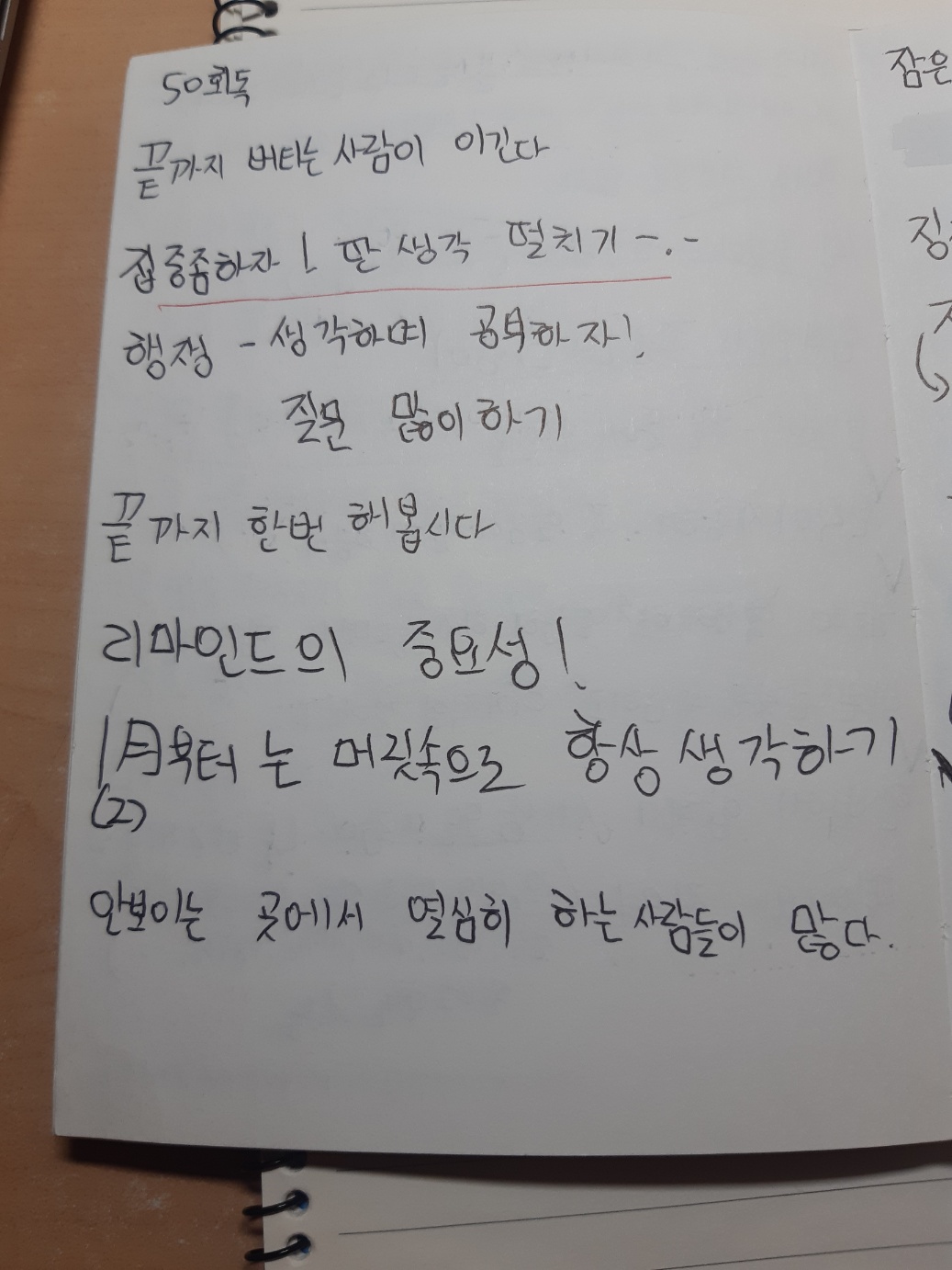 또 다른 저의 불안, 강박증세 극복방법은 감정노트를 작성하는 것이었습니다. 감정노트는 제가 이름을 지은것인데 작은 휴대용 메모 수첩에 마음의 소리를 적는 것입니다. 저는 그 노트에 주로 다짐, 희망, 목표, 위로, 채찍질, 와닿는 강사님들의 말씀 등과 같은 어구들을 적었습니다. 지금 가장 기억에 남는 단어는 '그럼에도 불구하고'입니다. 반의어에는 '다만', '그러나', '그런데' 등과 같은 단어들이 있으나, 개인적으로 '그럼에도 불구하고' 뒤에는 보다 희망적인 내용이 이어질것 같다는 느낌(?)이 있었습니다. 이 단어를 평소에도 마음속에 품고다녔는데 예를 들어, 지치고 힘들때 "너무 힘들지만 그럼에도 불구하고 앞으로 더 잘할수 있을거야" 혹은 모의고사를 잘 보았을 때도 "시험을 잘 봤지만 그럼에도 불구하고 방심하지 않을거야"등과 같은 방법으로 멘탈을 잡고자 했었습니다.