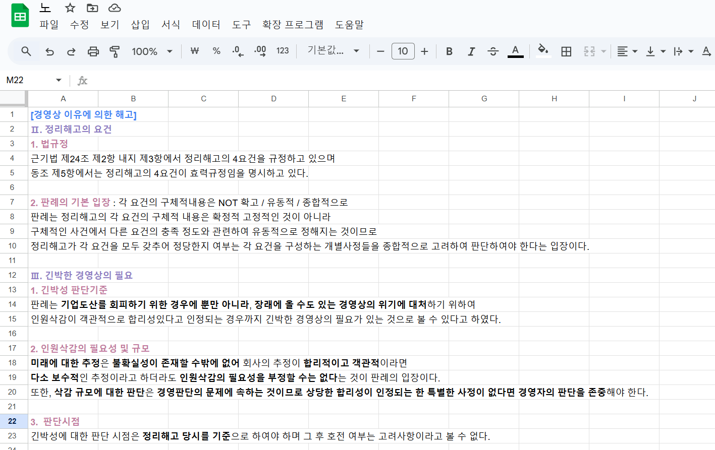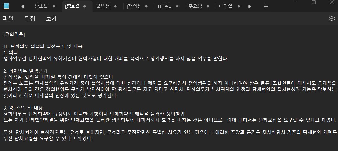 저도 처음에는 A급 위주의 쟁점을 암기하기 위한 목적으로 타이핑한 것을 시작으로 하였지만, 이것을 근무시간에 짧게 짧게 활용할 수 있겠다는 생각이 들어 노동법의 경우에는 강의에서 다뤄지는 대부분의 주제를 옮겨두어 근무시간 틈틈이 읽었고요. (노동/민소/행쟁 순으로 활용) 조금 더 여유 있을 때에는 메모장 보시는 것처럼 특정 주제를 타이핑으로 현출했습니다. 2~3기 즈음에는 어느 정도 공부가 되어 있기 때문에 생각보다 짧은 시간 안에 가능해서 직장병행이시라면 이러한 방법을 활용해보시면 좋을 것 같습니다.