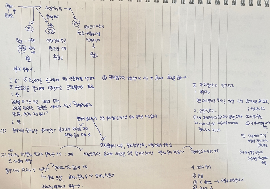 이에 쟁점 잡기 + 목차 잡기 + 판례의 주요 문구 현출 + 결론 내리기를 스스로 할 수 있어야 한다고 생각하고, 이러한 방식으로 법과목 연습을 했습니다. 실제 답안만큼 작성하는 것은 시간이 허락되지 않고 손목에도 무리가 가기 때문에 아래의 예시처럼 사안 도식화 > 쟁점 잡기 > 목차 잡기 > 주요 판례 문구 현출 > 사안 결론 내리는 정도로만 연습을 했고요.