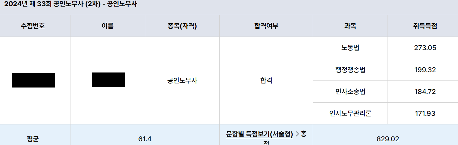 (노동법 56.65, 행쟁 64.6, 인사관리 53.2, 민소 49 > 평균 56.85로 불합격 / 캡처본이 사라져 정확하진 않습니다.)
