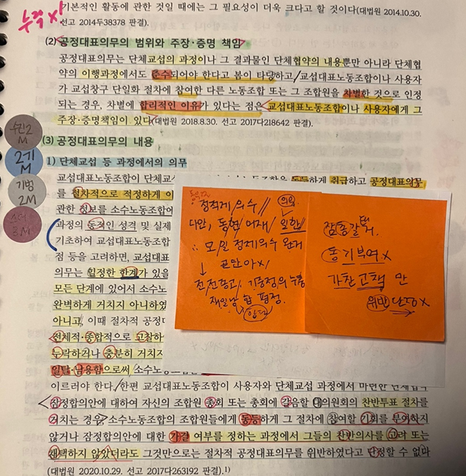 이미 노무사로 활동중인 사내노무사, 혹은 친구들은 직장병행을 하는 것도 굉장히 체력이 부칠 수 있으니 지치지 않도록 부담갖지 말고 공부시간을 늘려가라고 조언을 해준 덕(?)이었는데, 저는 오히려 이런 생각이 수험기간을 늘리는 패인이라고 생각합니다.
