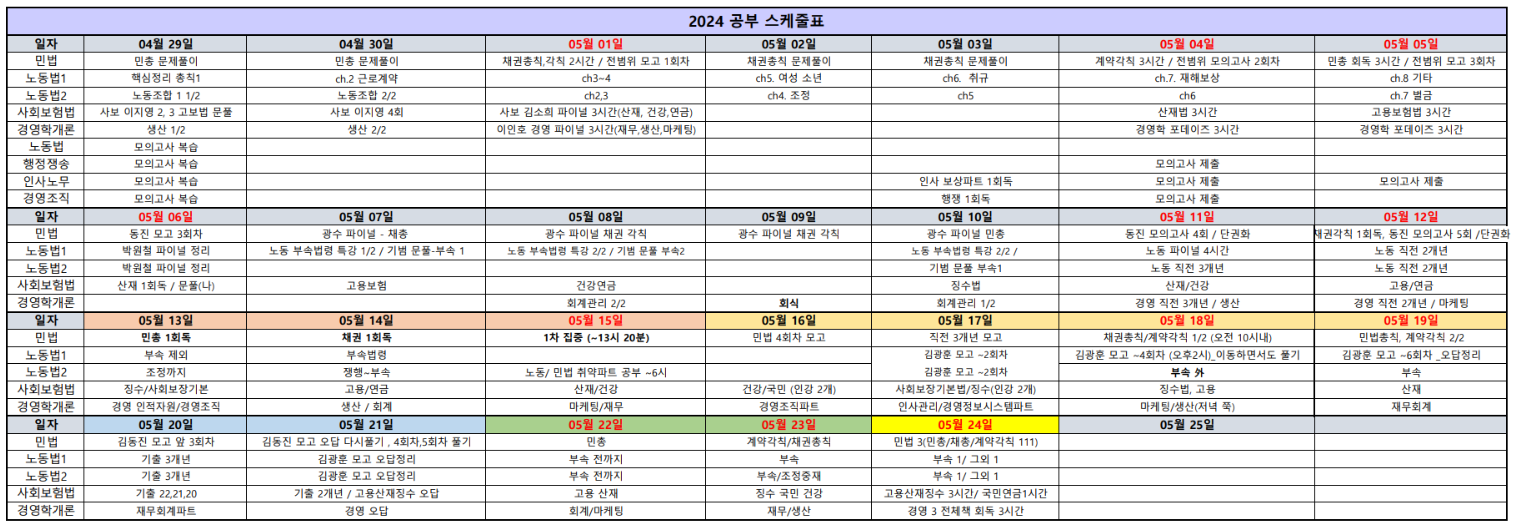 - 회독시간이 부족한 직장인인 만큼 철저한 스케줄관리가 필요합니다. 처음에 회독 스케줄을 짤 때 정말 힘드실텐데, 꿀팁아닌 꿀팁이라면 내가 공부할 수 있는 공부시간 총량을 먼저 계산 → 각 과목별 분배 비율 수립 → 과목별로 진도 짜기 순으로 해보시면 조금 편하실거에요