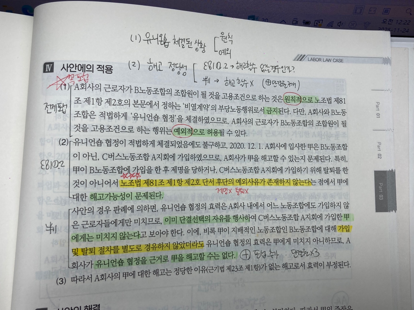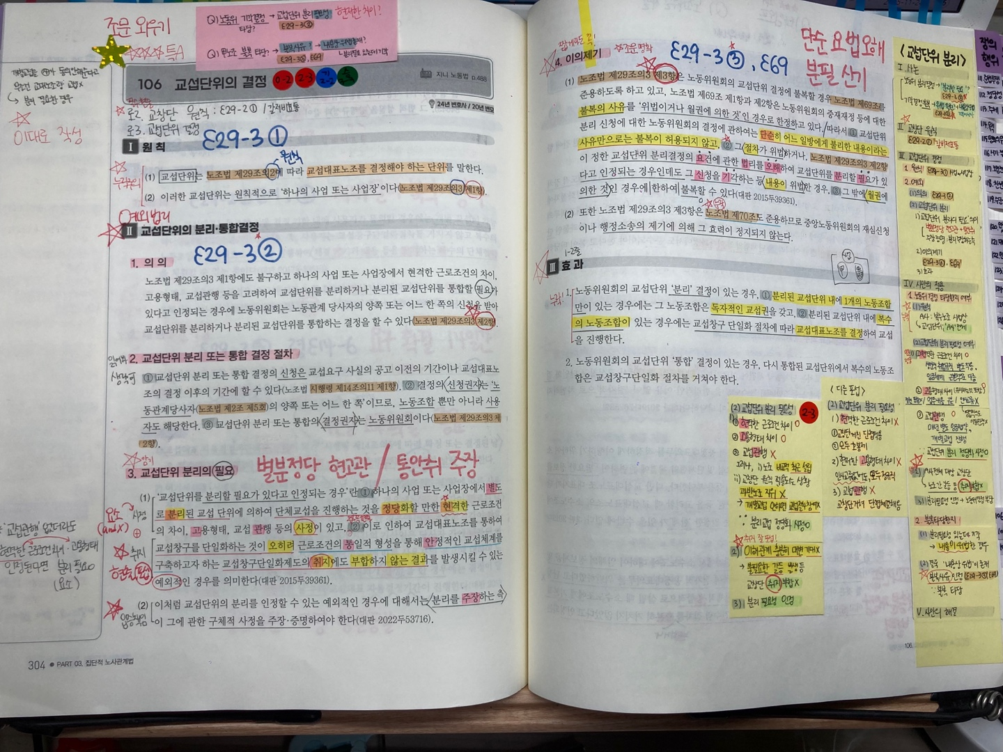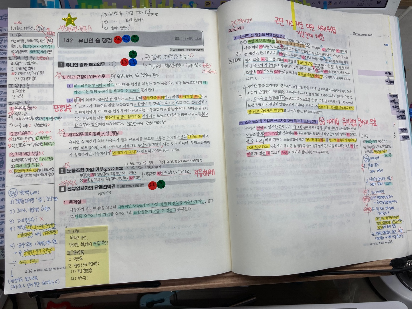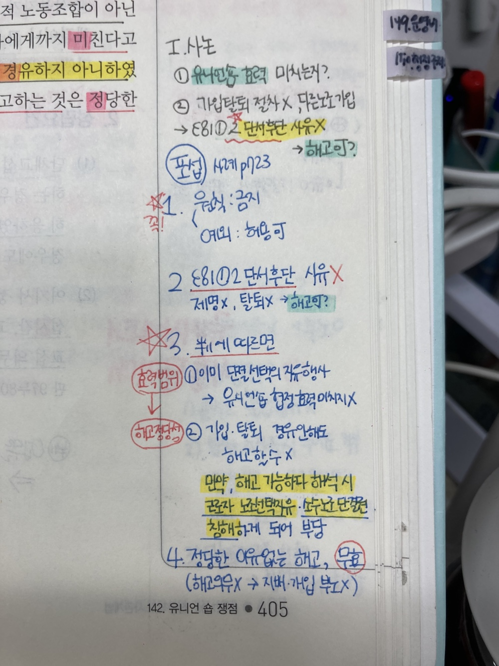 기존 판례는 익숙했기에 두문자를 적극 활용해 일반론을 암기했습니다. 플랫폼종사자 판례처럼 주시는 자료와 필기자료를 책에 붙여두고 반복해서 봤습니다.