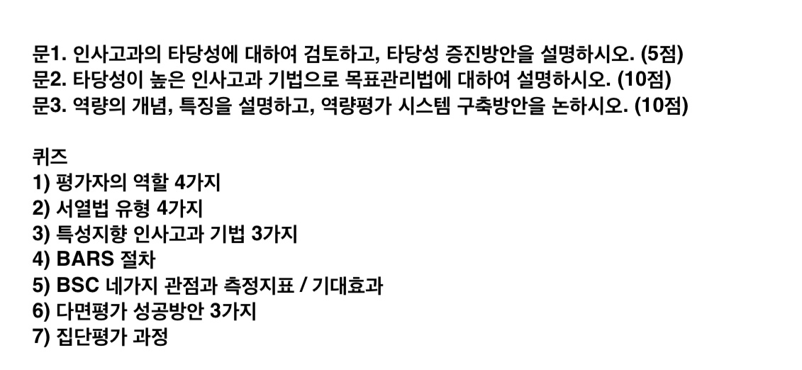 - 방식 : 25점 문제 준비, 현출 후 교환해서 채점 / 퀴즈 4~5개 구술(ex. 개념, 절차 등)
