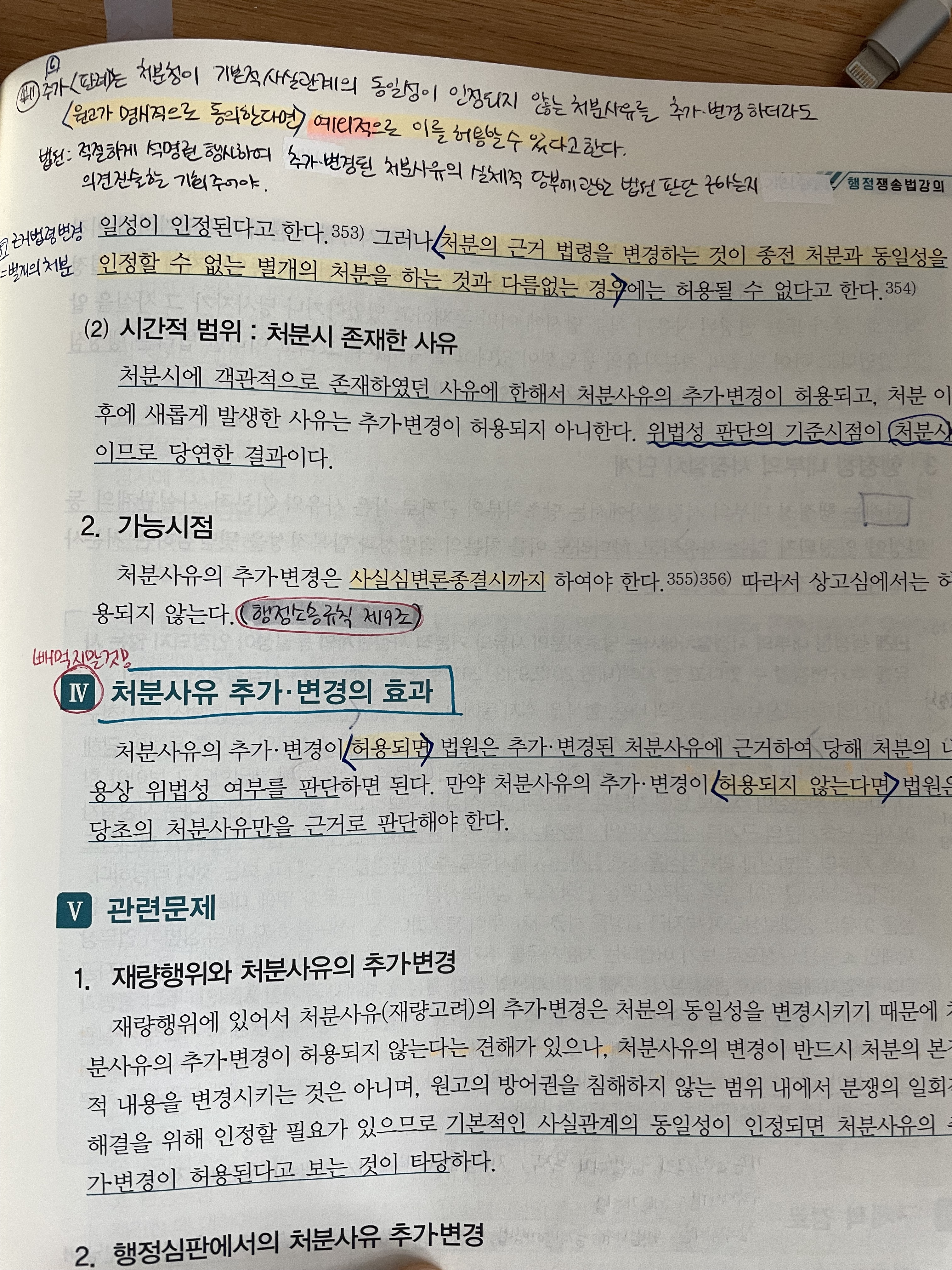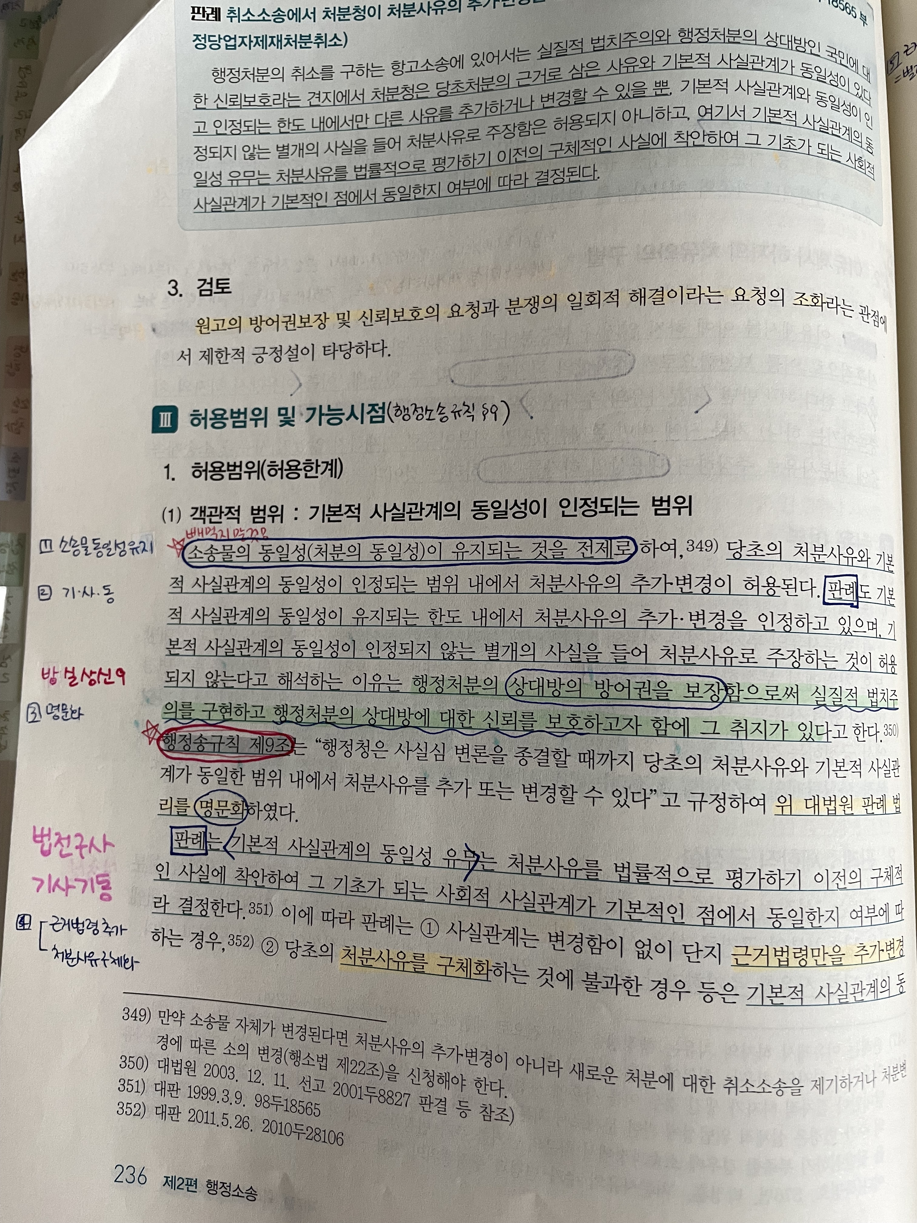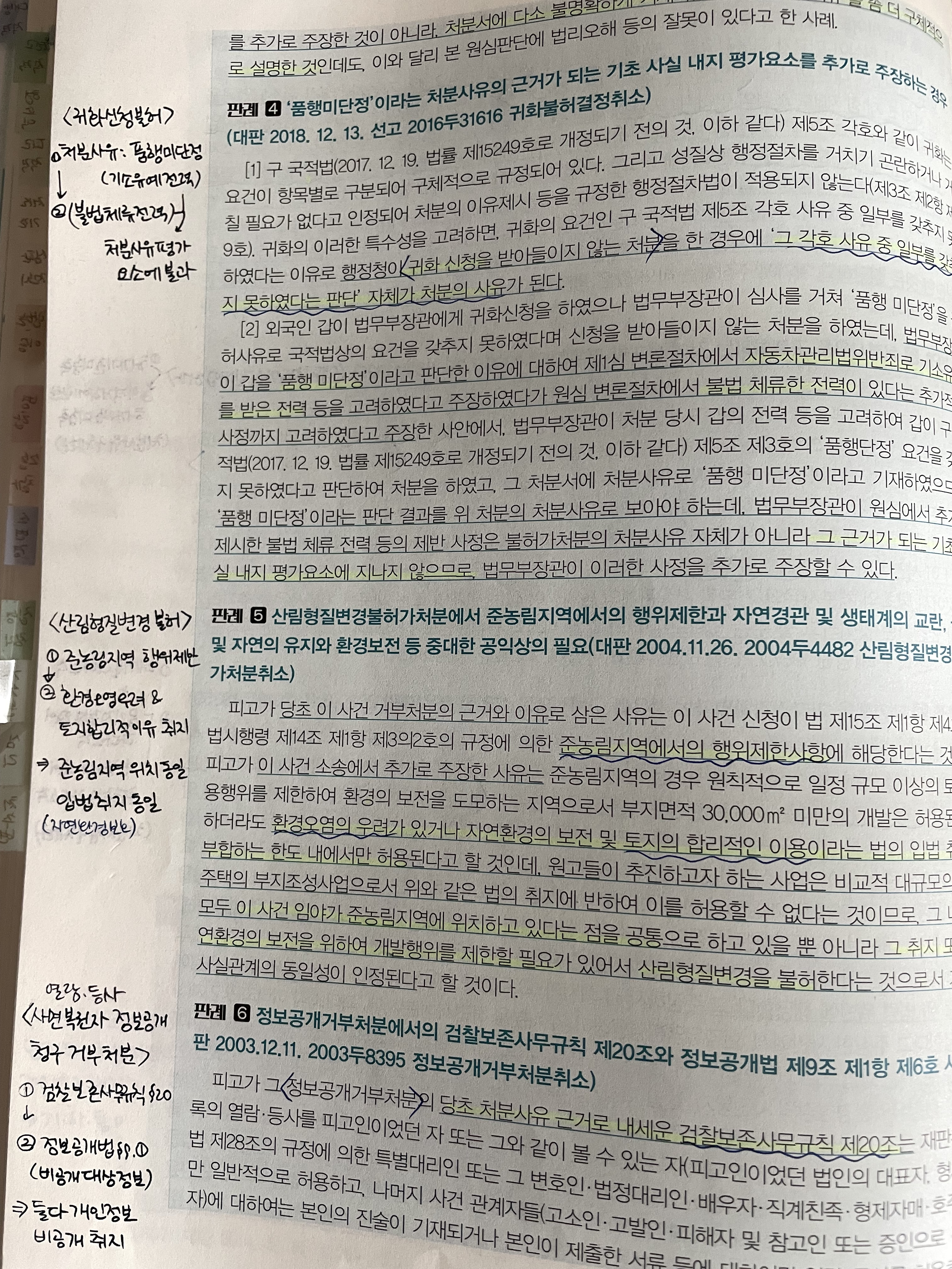(단권화 방법: 1. 행쟁은 잘 안 외워지는 부분이나 현출하고 싶은 내용 형광펜, 키워드 동그라미/ 2. 왼쪽에 현출할 내용 번호 따서 개요 정리/3. 추가 판례 단권화(올해 1-1문 처추변 내용은 아래처럼 단권화/ 3. 모든 판례에 제목 달아서 결론까지 한 눈에 볼 수 있게 정리. 특히 처분성 인정이나 처추변 인정 여부도 전부 판례에 인정/불인정 이유까지 간략하게 적어둠)