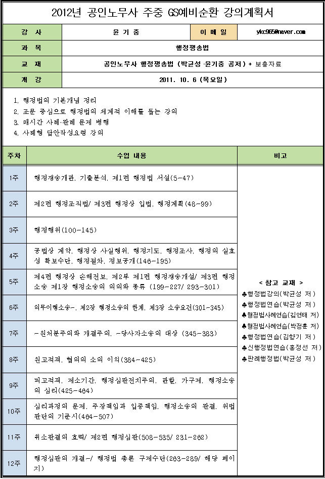 GS예비순환 행정쟁송법 (윤기중교수) 강의계획서 작성자종로박문각학원|작성시간11.09.20|조회수153 목록 댓글 0 글자크기 작게가 글자크기 크게가 다음검색 현재 게시글 추가 기능 열기 북마크 공유하기 신고 센터로 신고 댓글 댓글 0 댓글쓰기 답글쓰기 댓글 리스트