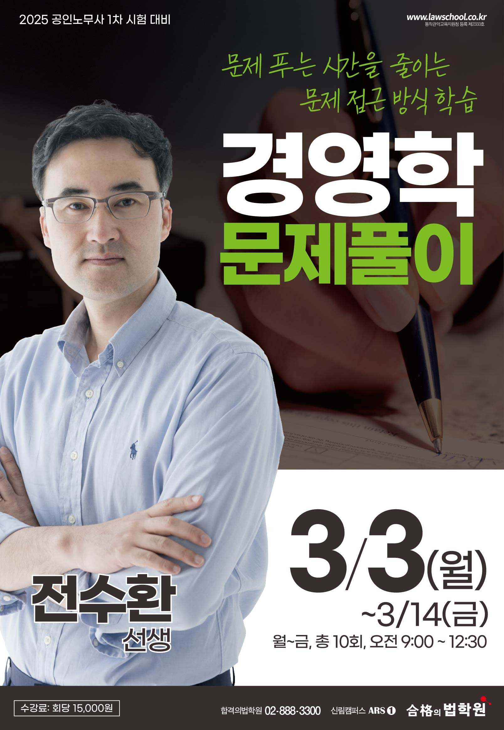 이해선, 전수환 : 경영학 문제풀이 - 3/3(월), 3/10(월) 개강! 작성자★합격의법학원★|작성시간25.02.17|조회수277 목록 댓글 0 글자크기 작게가 글자크기 크게가 이해선 노무사 - 경영학 문제풀이 강의계획서.pdf127.64KB 첨부파일첨부된 파일이 4개 있습니다. jpg 파일 250217_cpla_a.jpg 다운로드 jpg 파일 250217_cpla_b.jpg 다운로드 gif 파일 btn_aca_account.gif 다운로드 pdf 파일 이해선 노무사 - 경영학 문제풀이 강의계획서.pdf 다운로드 다음검색 현재 게시글 추가 기능 열기 북마크 공유하기 신고 센터로 신고 댓글 댓글 0 댓글쓰기 답글쓰기 댓글 리스트