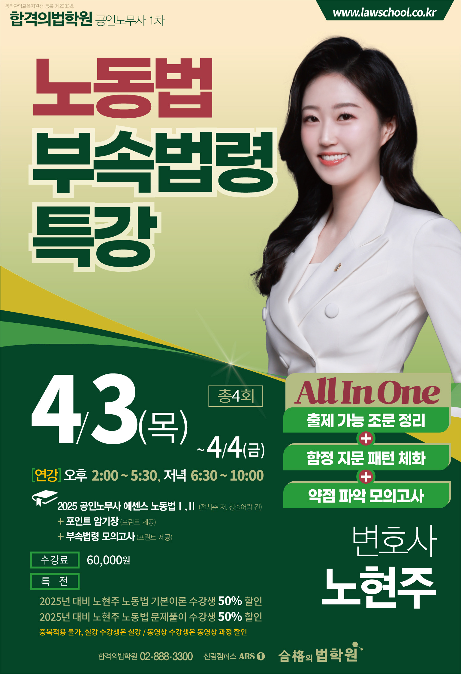 노현주 변호사 : 노동법 부속법령 특강 - 4/3(목) 개강! 작성자★합격의법학원★|작성시간25.03.14|조회수756 목록 댓글 2 글자크기 작게가 글자크기 크게가 노현주 변호사 - 노동법 부속법령 특강 강의계획서(수정).pdf113.27KB 첨부파일첨부된 파일이 3개 있습니다. gif 파일 btn_aca_account.gif 다운로드 jpg 파일 250314_cpal_b.jpg 다운로드 pdf 파일 노현주 변호사 - 노동법 부속법령 특강 강의계획서(수정).pdf 다운로드 다음검색 현재 게시글 추가 기능 열기 북마크 공유하기 신고 센터로 신고 댓글 댓글 2 댓글쓰기 답글쓰기 댓글 리스트 삭제된 댓글입니다. 답댓글 작성자★합격의법학원★ 작성자 본인 여부 작성자 | 작성시간 25.03.20 안녕하세요:D 네~! 동영상 강의로도 개강됩니다. 댓글 전체보기