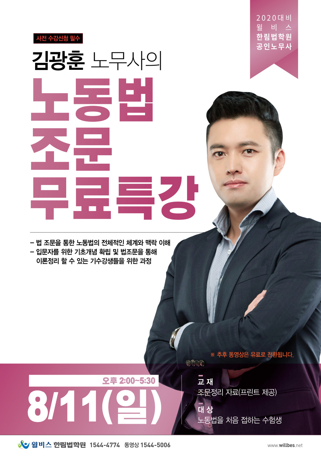 2020년 대비 김광훈 노무사의 노동법 조문 무료특강 8/11(일) 개강!! 작성자한림법학원|작성시간19.08.02|조회수598 목록 댓글 0 글자크기 작게가 글자크기 크게가 다음검색 현재 게시글 추가 기능 열기 북마크 공유하기 신고 센터로 신고 댓글 댓글 0 댓글쓰기 답글쓰기 댓글 리스트
