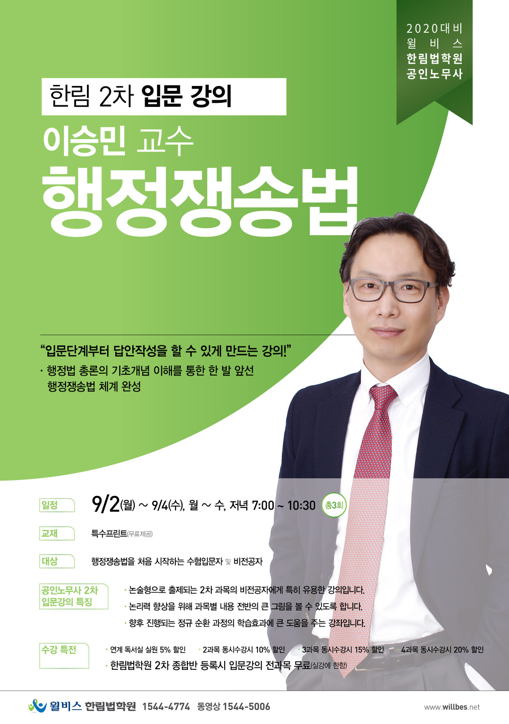 2020대비 2차 입문강의 이승민 교수 행정쟁송법 강의 안내 9/2(월) 개강! 작성자한림법학원|작성시간19.08.26|조회수359 목록 댓글 0 글자크기 작게가 글자크기 크게가 다음검색 현재 게시글 추가 기능 열기 북마크 공유하기 신고 센터로 신고 댓글 댓글 0 댓글쓰기 답글쓰기 댓글 리스트