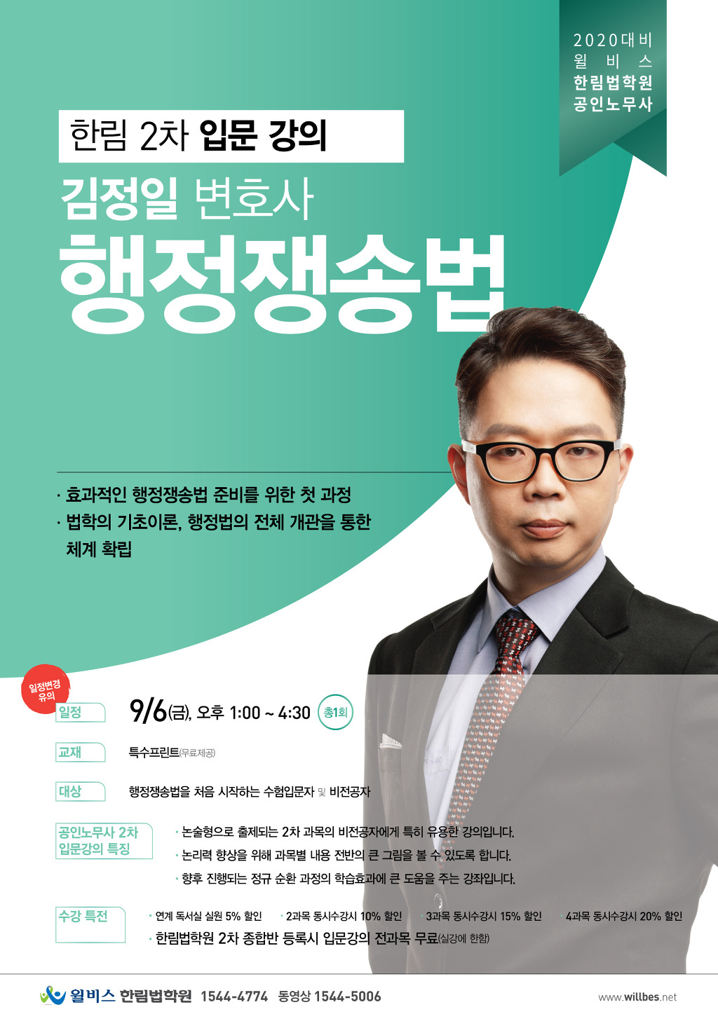 [일정변경 유의] 2020대비 2차 입문강의 김정일 변호사 행정쟁송법 강의 안내 9/6(금) 개강! 작성자한림법학원|작성시간19.08.26|조회수385 목록 댓글 0 글자크기 작게가 글자크기 크게가 다음검색 현재 게시글 추가 기능 열기 북마크 공유하기 신고 센터로 신고 댓글 댓글 0 댓글쓰기 답글쓰기 댓글 리스트