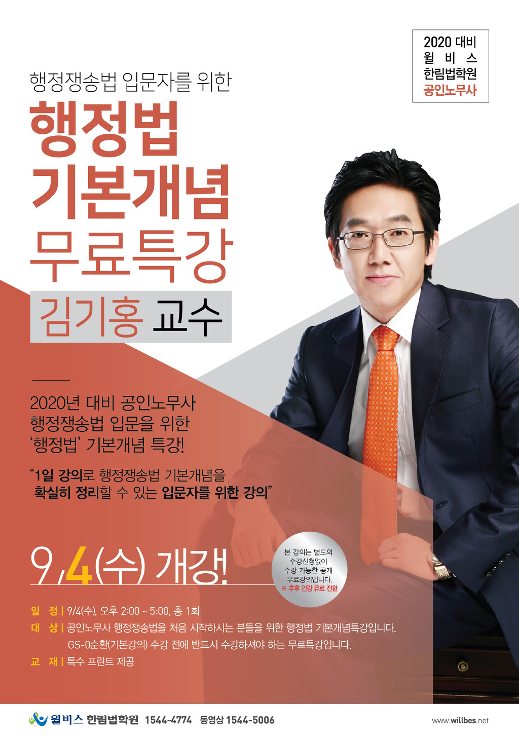 김기홍 교수의 행정쟁송법 입문자를 위한 행정법 기본개념 특강 9/4(수) 개강! 작성자한림법학원|작성시간19.08.26|조회수739 목록 댓글 0 글자크기 작게가 글자크기 크게가 다음검색 현재 게시글 추가 기능 열기 북마크 공유하기 신고 센터로 신고 댓글 댓글 0 댓글쓰기 답글쓰기 댓글 리스트
