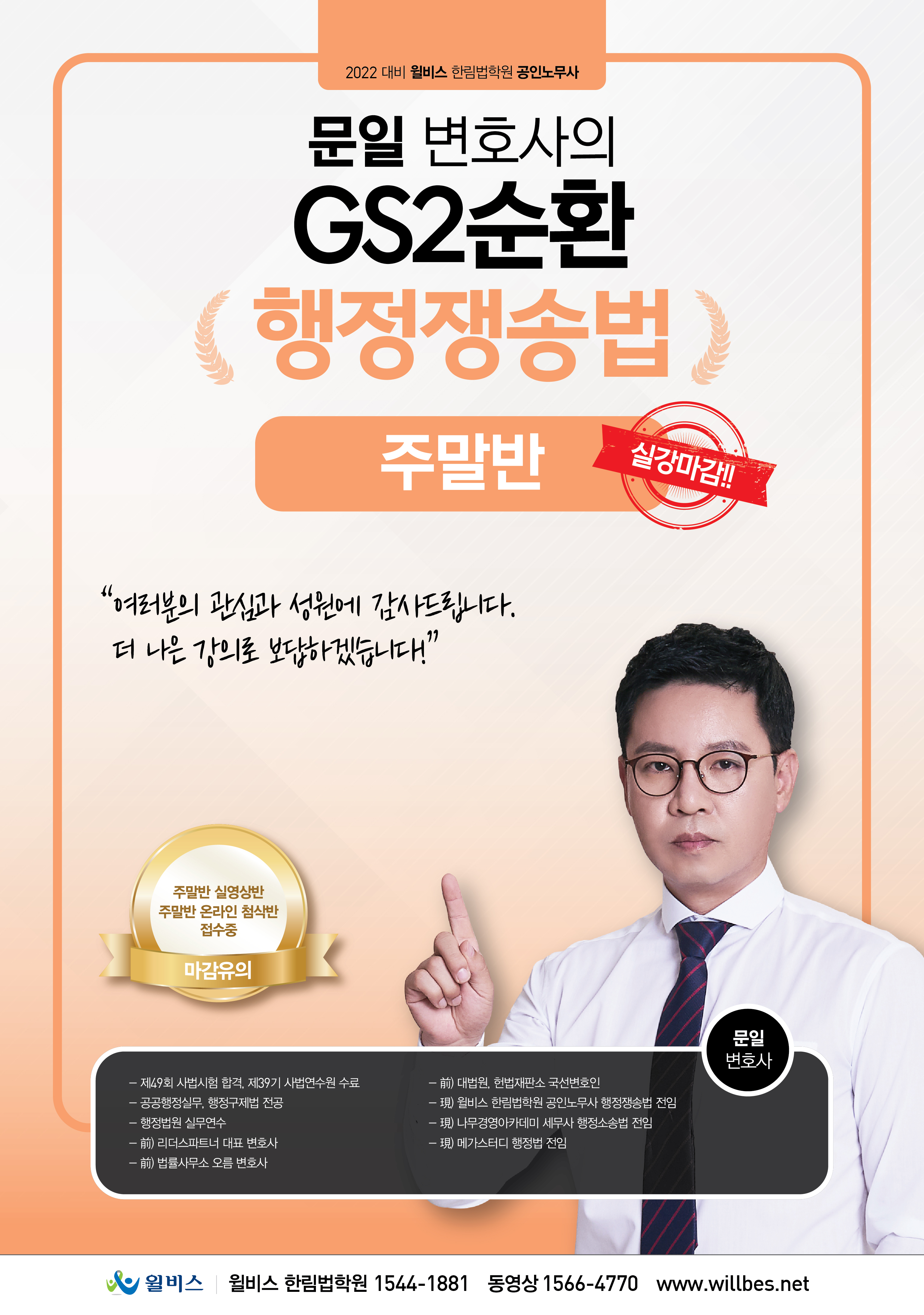 [실강마감] 2022년대비 GS2순환(주말반) 문일 행정쟁송법 작성자한림법학원|작성시간22.03.22|조회수476 목록 댓글 0 글자크기 작게가 글자크기 크게가 다음검색 현재 게시글 추가 기능 열기 북마크 공유하기 신고 센터로 신고 댓글 댓글 0 댓글쓰기 답글쓰기 댓글 리스트
