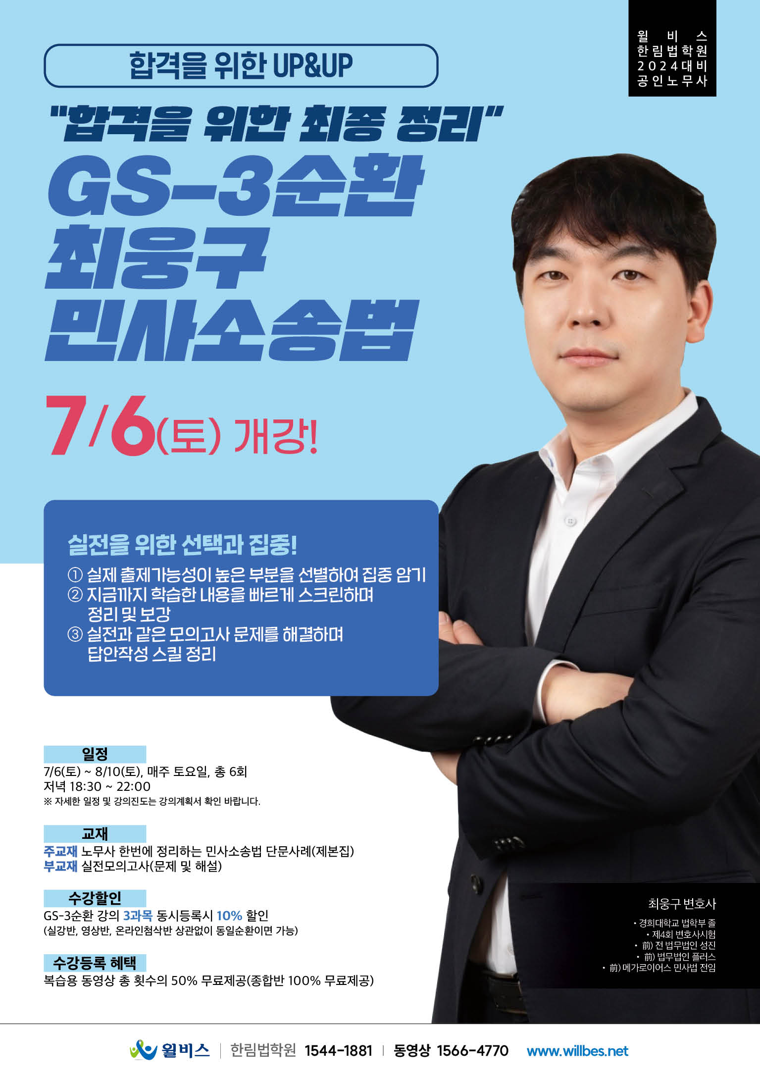 2024대비 / GS-3순환 최웅구 민사소송법 - 7/6(토) 개강 작성자한림법학원|작성시간24.06.25|조회수171 목록 댓글 0 글자크기 작게가 글자크기 크게가 다음검색 현재 게시글 추가 기능 열기 북마크 공유하기 신고 센터로 신고 댓글 댓글 0 댓글쓰기 답글쓰기 댓글 리스트