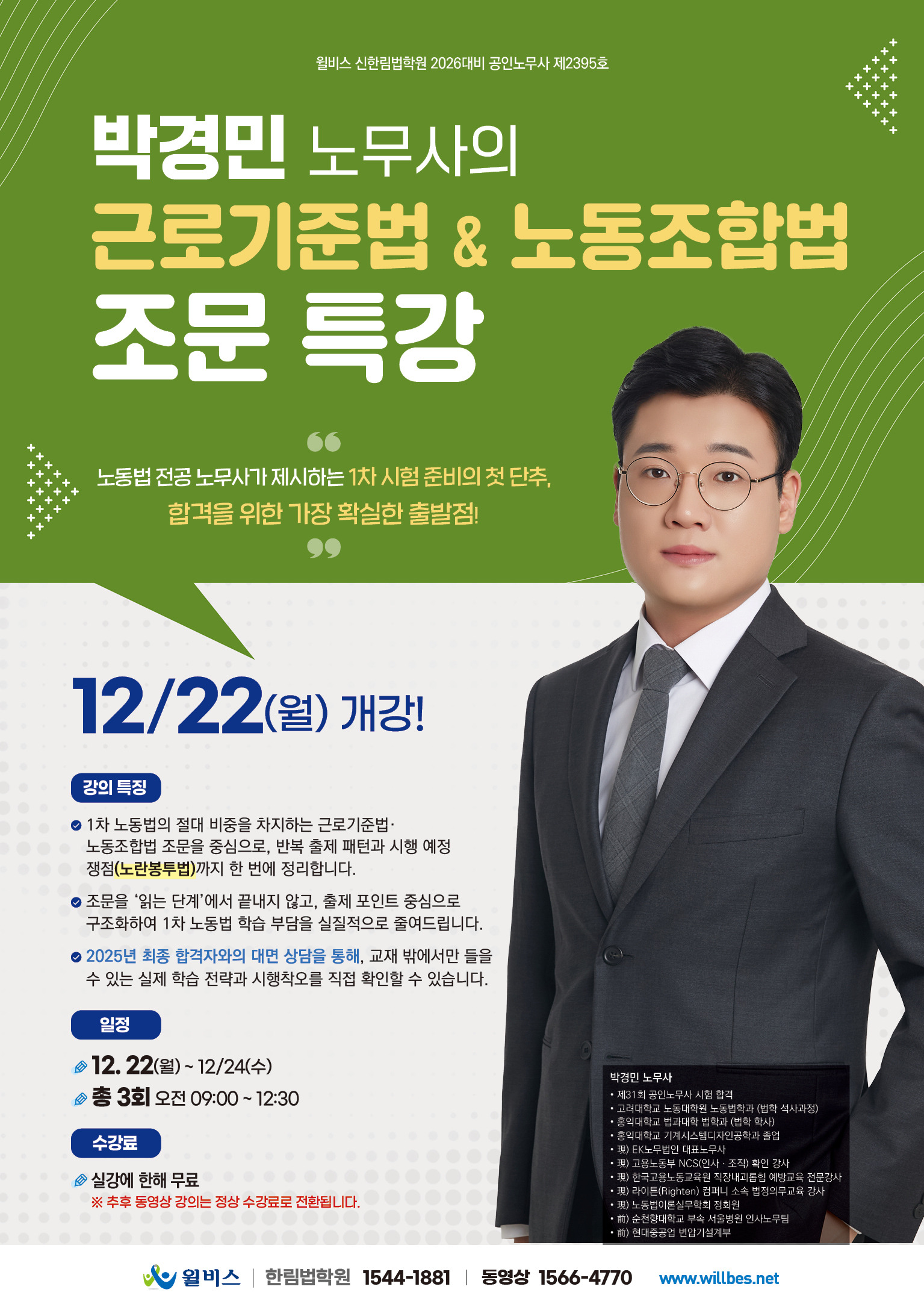 박경민 노무사의 근로기준법&노동조합법 조문특강 - 12/22(월) 개강 작성자한림법학원|작성시간25.12.17|조회수287 목록 댓글 0 글자크기 작게가 글자크기 크게가 다음검색 현재 게시글 추가 기능 열기 북마크 공유하기 신고 센터로 신고 댓글 댓글 0 댓글쓰기 답글쓰기 댓글 리스트