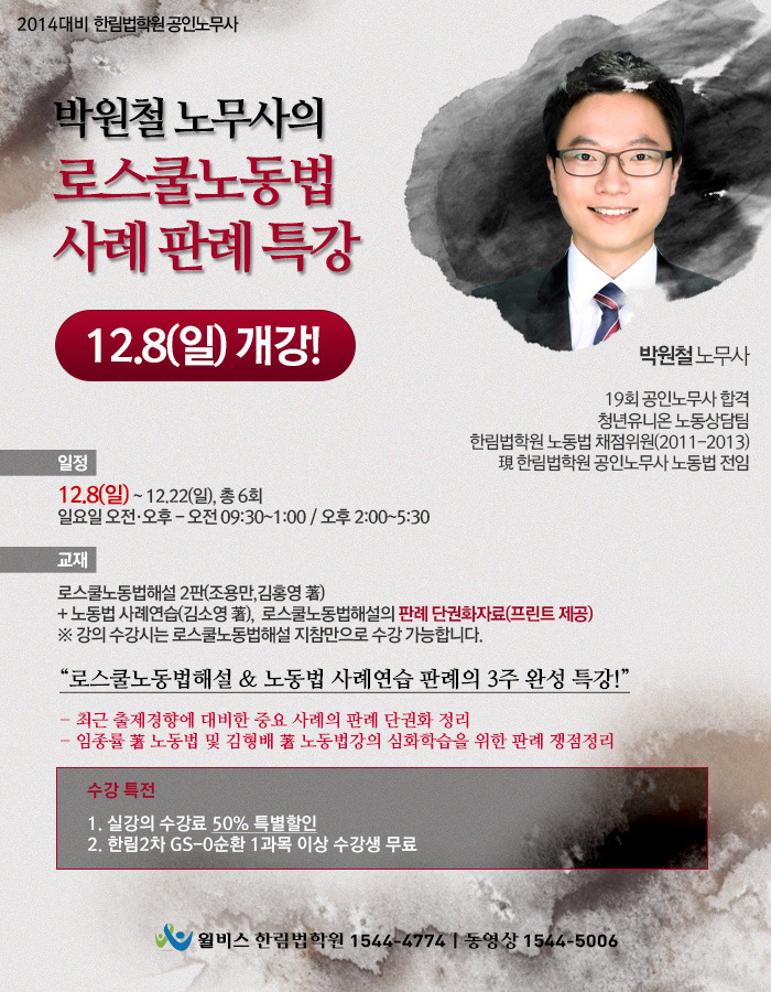 박원철 노무사의 로스쿨노동법 사례판례 단권화특강 안내 - 12.8(일) 개강! 작성자한림법학원|작성시간13.11.18|조회수562 목록 댓글 2 글자크기 작게가 글자크기 크게가 다음검색 현재 게시글 추가 기능 열기 북마크 공유하기 신고 센터로 신고 댓글 댓글 2 댓글쓰기 답글쓰기 댓글 리스트 작성자추운 가을 | 작성시간 13.12.09 강의수강시 로스쿨해설만 있으면 된다 나오는데 김소영 저는 어찌하는건지요? 동강을 들을 계획하다가 보고 문의드립니다. 답댓글 작성자한림법학원 작성자 본인 여부 작성자 | 작성시간 13.12.10 안녕하세요? 한림법학원입니다.김소영 교수님의 사례집 내용은 로스쿨노동법해설과 중복되지 않는 판례만을 단권화 자료로 배부하며,강의 수강시에는 로스쿨노동법해설 2판만 지참하시면 됩니다.감사합니다. 댓글 전체보기