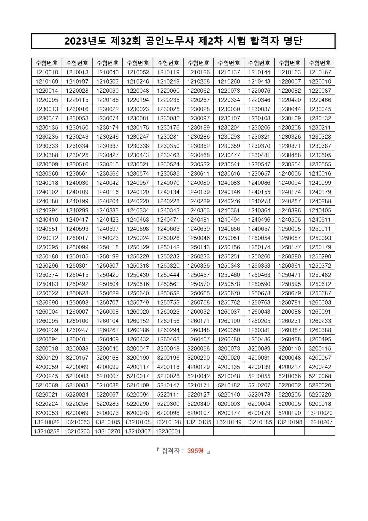 2023년도 제32회 공인노무사 제2차 시험 합격자 공고 작성자이패스노무사|작성시간23.11.22|조회수1,088 목록 댓글 0 글자크기 작게가 글자크기 크게가 안녕하세요.이패스노무사입니다. 2023년도 제32회 공인노무사 제2차 시험 합격자 공고입니다.총 합격자는 395명입니다. 합격하신 모든 분들 축하드립니다~ ^^ 2023년도 제32회 공인노무사 제2차 시험 합격자 공고 및 명단.zip314.40KB 첨부파일첨부된 파일이 2개 있습니다. jpg 파일 2023년도 제32회 공인노무사 제2차 시험 합격자 명단.jpg 다운로드 zip 파일 2023년도 제32회 공인노무사 제2차 시험 합격자 공고 및 명단.zip 다운로드 다음검색 현재 게시글 추가 기능 열기 북마크 신고 센터로 신고 댓글 댓글 0 댓글쓰기 답글쓰기 댓글 리스트
