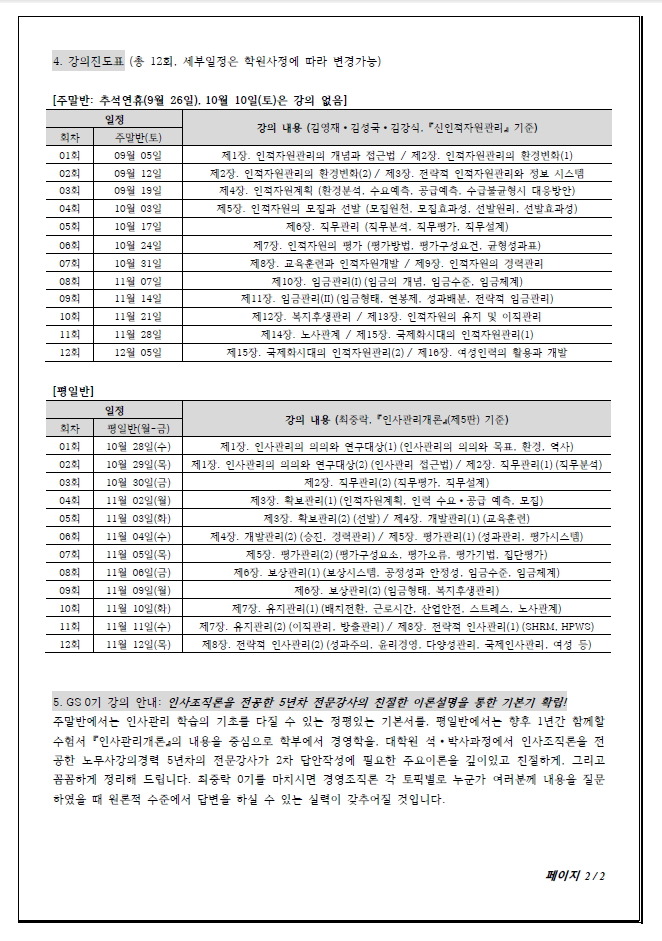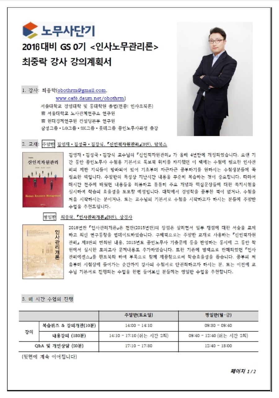 최중락 선생님의 GS 0기 인사노무관리론 강의계획서를 공지합니다.