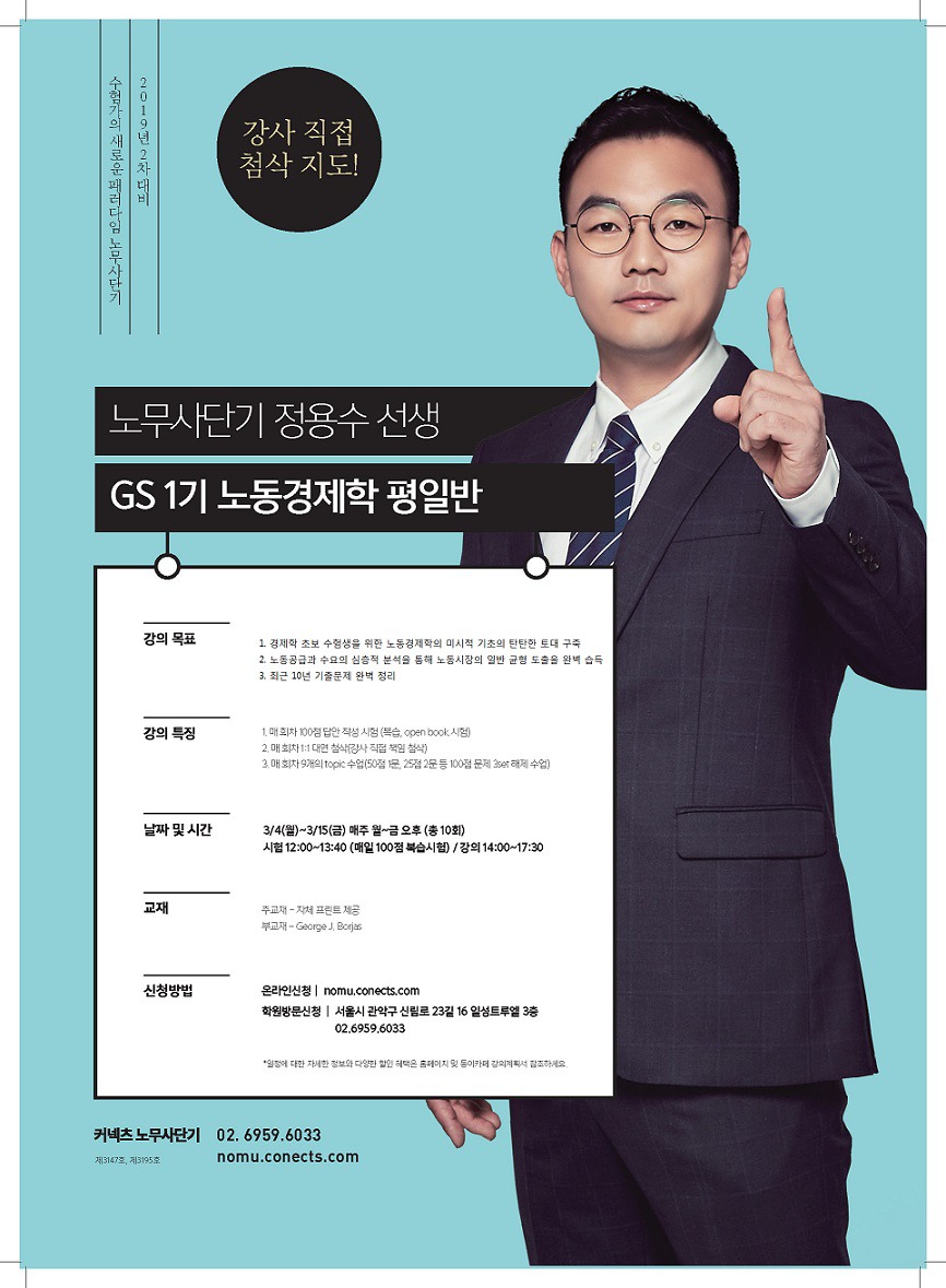 [강의안내] 19년 2차 대비 정용수 교수의 노동경제학 GS 1기 평일반 개강안내 - 3/4(월) 오후 大 개강!(강의계획서 포함) 작성자노무사단기_학원|작성시간19.02.21|조회수196 목록 댓글 2 글자크기 작게가 글자크기 크게가 2019 GS 1기 정용수T_노동경제학 강의계획서.pdf 첨부파일첨부된 파일이 2개 있습니다. jpg 파일 정용수T 1기 평일반.jpg 다운로드 pdf 파일 2019 GS 1기 정용수T_노동경제학 강의계획서.pdf 다운로드 다음검색 현재 게시글 추가 기능 열기 북마크 공유하기 신고 센터로 신고 댓글 댓글 2 댓글쓰기 답글쓰기 댓글 리스트 삭제된 댓글입니다. 해당 댓글은 작성자와 운영진만 볼 수 있습니다. 댓글 전체보기
