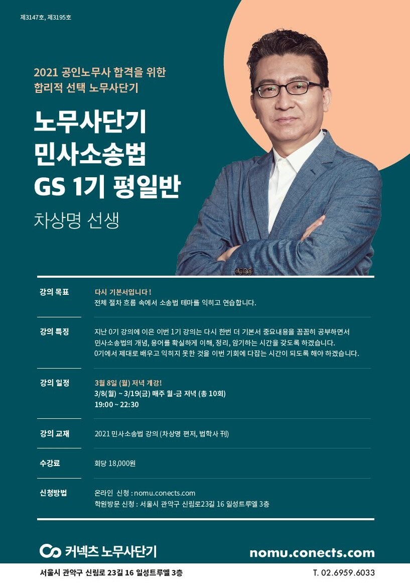 [강의안내] 21년 2차대비 차상명 교수의 민사소송법 GS 1기 평일반 - 3/8(월) 저녁 개강!(강의계획서 첨부) 작성자노무사단기_학원|작성시간21.02.24|조회수478 목록 댓글 0 글자크기 작게가 글자크기 크게가 수강신청 하러가기 >>클릭 2021 GS 1기 차상명T_민사소송법(평일반)강의계획서(완성).pdf169.46KB 첨부파일첨부된 파일이 2개 있습니다. jpg 파일 차상명T 민소 GS 1 평일반_1.jpg 다운로드 pdf 파일 2021 GS 1기 차상명T_민사소송법(평일반)강의계획서(완성).pdf 다운로드 다음검색 현재 게시글 추가 기능 열기 북마크 공유하기 신고 센터로 신고 댓글 댓글 0 댓글쓰기 답글쓰기 댓글 리스트