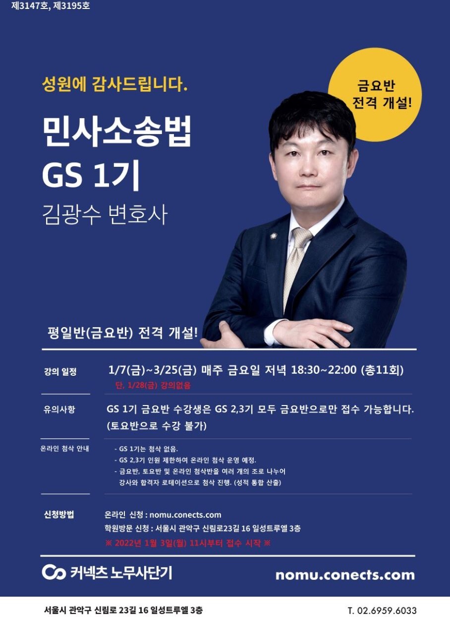 [전격개설] 김광수 변호사의 민사소송법 GS 1기 금요반 전격 개설! - 1/7(금) 저녁 개강! 작성자노무사단기_학원|작성시간21.12.24|조회수720 목록 댓글 0 글자크기 작게가 글자크기 크게가 수강신청 하러가기 >>클릭※ 1월 3일(월) 오전 11시부터 접수 가능합니다.2022 김광수T_민사소송법 GS 1기 강의계획서.pdf181.21KB 첨부파일첨부된 파일이 2개 있습니다. etc 파일 김광수T 민소 실강마감(금요반 개설)1.JPG 다운로드 pdf 파일 2022 김광수T_민사소송법 GS 1기 강의계획서.pdf 다운로드 다음검색 현재 게시글 추가 기능 열기 북마크 공유하기 신고 센터로 신고 댓글 댓글 0 댓글쓰기 답글쓰기 댓글 리스트
