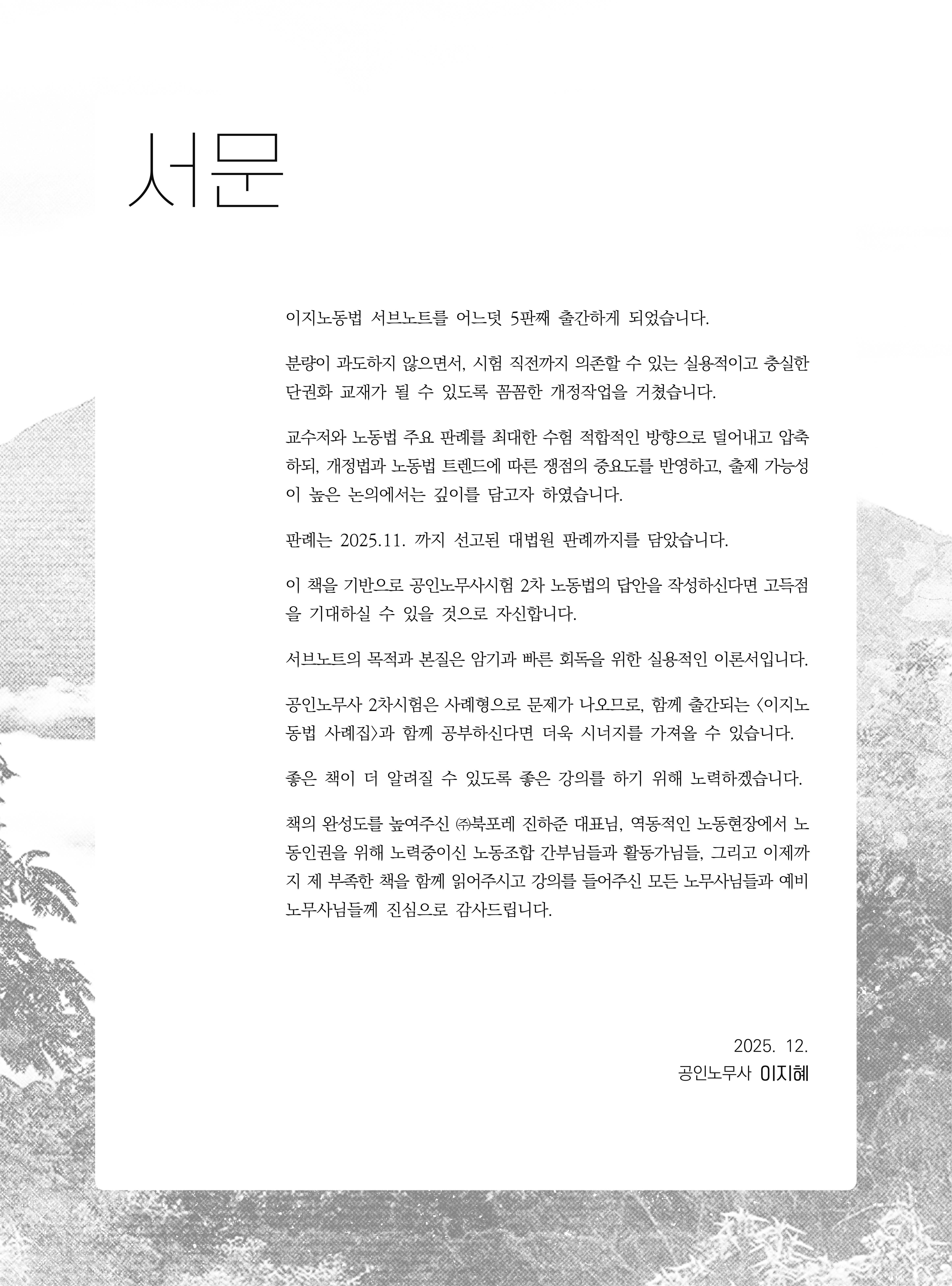 [출간안내] 理知 노동법 서브노트(제5판)_이지혜 노무사 작성자THE 프라임|작성시간14:39|조회수88 목록 댓글 0 글자크기 작게가 글자크기 크게가 2026 이지혜 노동법 GS1기 평일반_교재 교재 구매하기 >> 클릭 >> 다음검색 현재 게시글 추가 기능 열기 북마크 공유하기 신고 센터로 신고 댓글 댓글 0 댓글쓰기 답글쓰기 댓글 리스트
