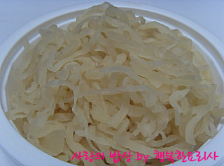3. 짠무는 곱게 채썰어 여러번 물에 헹궈 물기를 짠다.