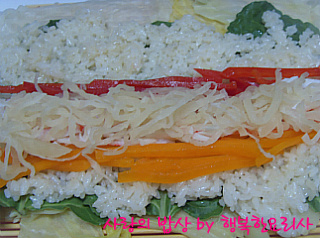 5. 근대 위에 밥,파프리카, 짠무채를 올려단단하게 만다.(계란지단을 넣어도 됩니다.)