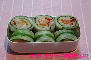 풀어지지 않게 묶은 다음 먹기좋은 크기로 썰어 도시락용기에 담는다.
