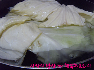 1. 손질한 양배추는 끓는 물에 약간의 소금을 넣어 데친 다음 물기를 뺀다.