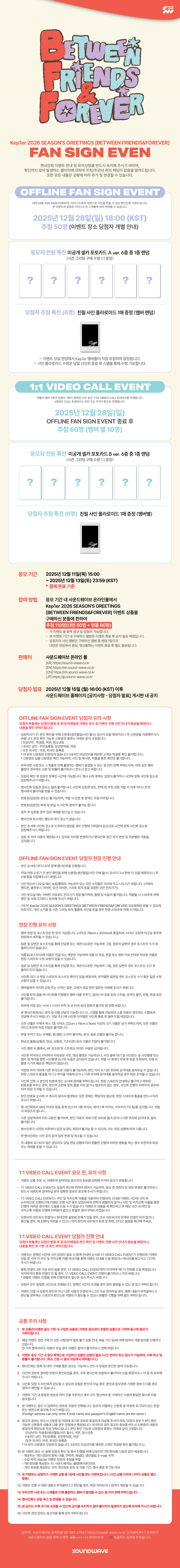 Kep1er 2026 SEASON'S GREETINGS 팬 사인회 안내_사운드웨이브 작성자Kep1er_official|작성시간25.12.11|조회수1,822 목록 댓글 0 글자크기 작게가 글자크기 크게가 안녕하세요. Kep1er 팬클럽 담당자 입니다. Kep1er 2026 SEASON'S GREETINGS <BETWEEN FRIENDS&FOREVER> 팬 사인회 안내드립니다. 다음검색 현재 게시글 추가 기능 열기 북마크 공유하기 신고 센터로 신고 댓글 댓글 0 댓글쓰기 답글쓰기 댓글 리스트
