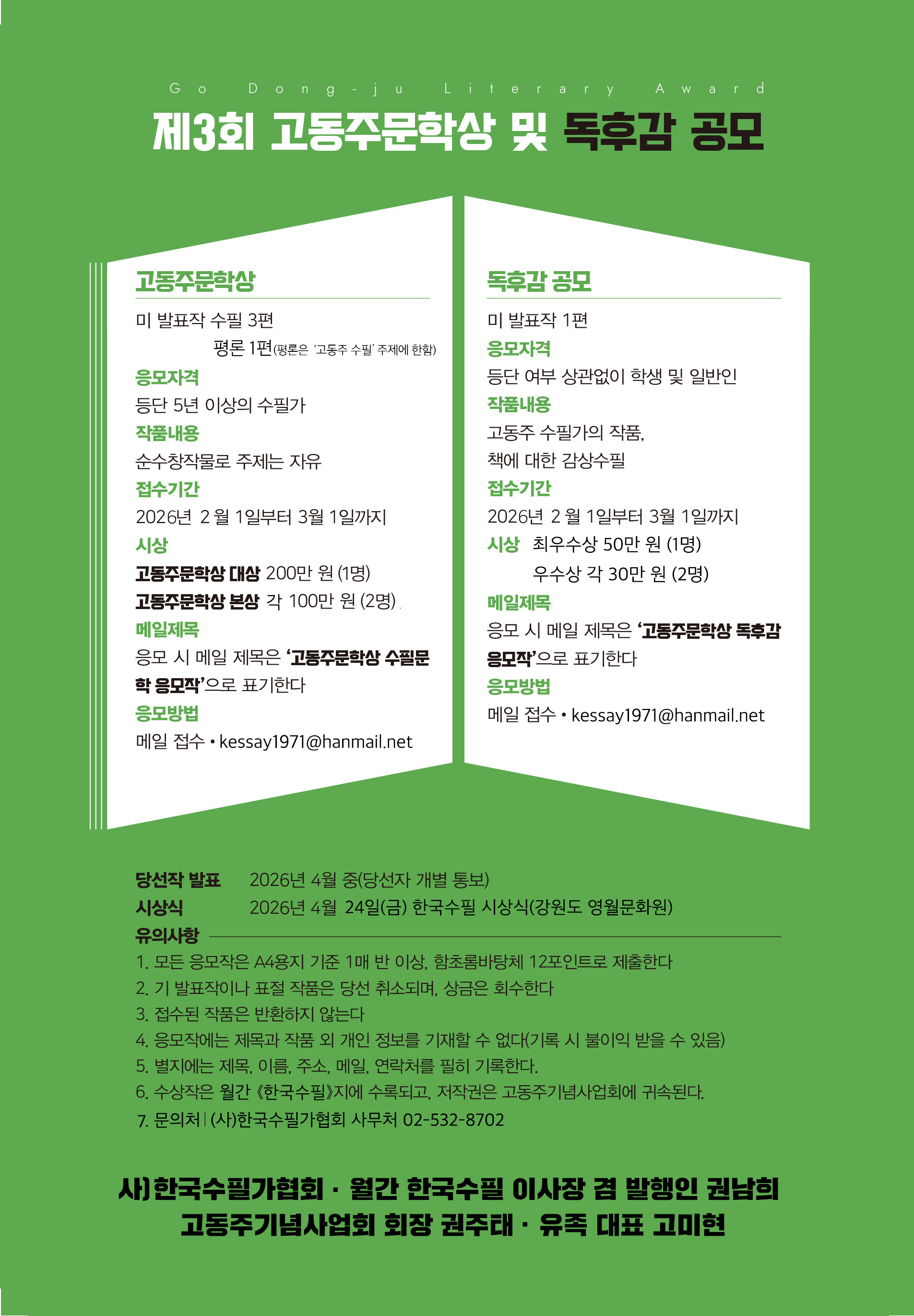 '고동주수필문학상' 및 '독서수필상'을 제정하여 공모하오니 역량 있는 분들의 많은 참여 바랍니다.
