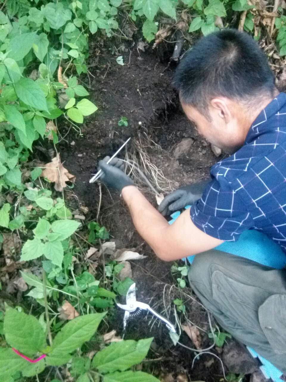 3. 마사토 위에 부엽토를 15cm 깊이가 되도록 채웁니다. 4. 장뇌산삼 종묘를 뿌리가 서로 닿지 않도록 부엽토 위에 뉘어 놓읍니다.